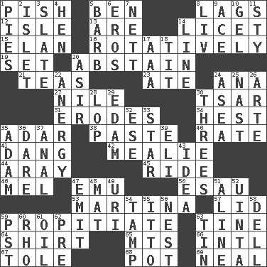 ACROSS 1. Expression of disdain 5. Benjamin's nick name 8. Fails to keep up a pace 12. Capri or Wright 13. "We ___ not amused" (Victoria) 14. It is permitted: Lat. 15. Style 16. Happening in regular succession 19. Put into a specified state 20. Choose not to consume 21. Beverages made from leaves 23. Had dinner 24. Santa ___, CA 27. "Death on the ____" 30. Russian ruler of old 31. Eats (away) 34. Behest 35. The sixth month of the Jewish calendar 38. Thick mixture 40. Assign a rank or rating to 41. Mild oath, euphamism for damn 42. Ear of corn 44. Like ___ of sunshine 45. Travel on or in a vehicle 46. Cartoonist voice _ Blanc 47. Australian flightless bird 50. He sold his birthright 53. Chrissie's court nemesis 57. Flaplike covering 59. Conciliate 63. Prong on a fork 64. Upper-body garment 65. Mountains (abbr.) 66. International (abbr.) 67. Lacquered or enameled metalware 68. Cooking vessel 69. Actress Patricia DOWN 1. Sliced desserts 2. Small island 3. Schedule 4. Layer 5. Sharp remark 6. Greek god of love 7. Remaining after all deductions 8. 54 in ancient Rome 9. Adept person 10. Set 11. Filthy place 14. Actor's bit 17. American Automobile Association (abbr.) 18. Teat (slang) 20. SW Saudi Arabia district 22. Disorder of the immune system 24. Toward the sea 25. Political cartoonist Thomas 26. Johnson of "Laugh-In" 28. Trim (branches) 29. Dutch treat 30. Threesomes 32. Compass dir. 33. Play the lead 35. First of billions? 36. Have the gumption 37. Of or related to the anus 39. Biblical high priest 43. The main thing one is thinking about 47. Send forth 48. Floor protector 49. RI univ. 51. Place in a line 52. National forest in Provo, Utah 54. Pack (down) 55. "Tell ____ the Marines!" 56. A home for chicks 58. Small valley 59. Pacific Standard Time (abbr.) 60. 17th letter of the Greek alphabet 61. Lubricate 62. Before (prefix) 63. Shallow baking pan