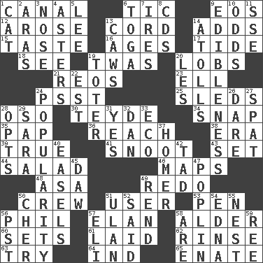 ACROSS 1. Lessep's creation 6. Nervous spasm 9. Greek goddess of the dawn 12. Came up 13. Drawstring 14. Does sums 15. Clothes sense 16. Grows older 17. Periodic rise and fall of the sea level 18. Observe 19. It was, poetically 20. Tennis shots 21. Vintage cars 23. Pipe bend 24. Inconspicuous attention getter 25. Bobsleighs 28. Bear (Spanish) 30. Miss Universe 1986, Barbara Palacios _ 34. Fastener 35. Infant food 36. Arrive at 38. Period 39. Loyal 41. Snob 43. Arrange properly for use 44. First course 46. Atlas contents 48. White ___ sheet 49. Redecorate 50. Ship's personnel 51. One who makes use of a thing 53. Fenced enclosure 56. Silvers or Donahue 57. Flair 58. Tree or shrub in the Birch family 60. Puts into a specified state 61. Put down 62. Remove soap 63. Attempt to accomplish something 64. Indiana (abbr.) 65. Related on the mother's side DOWN 1. Domesticated feline 2. Ancient river in northeast Turkey 3. Sense of smell 4. Michaelmas daisies 5. Area sheltered from the wind 6. Ancient Roman robe 7. Angers 8. Music discs 9. The property of being fit to eat 10. Likelihood 11. Compass dir. 13. Crow sounds 14. Ringlike coral islands and reefs 19. Carrier 20. French article 22. Eastern Standard Time (abbr.) 24. Teen's desire 26. Have the gumption 27. Argument over a trivial matter 28. Chooses 29. "Two Mules for Sister ____" 31. Affirmative reply 32. One of the 12 tribes of Israel 33. Environmental prefix 37. Baseball hit which scores a run 40. Artist's stands 42. Small amount or degree 45. Fool 47. Cotton for raincoats, e.g. 49. Tear apart 50. "Mermaids" star 51. Uhlan (variant) 52. Stated 54. Pulitzer Prize-winning author Ferber 55. Egg locale 56. Pacific Standard Time (abbr.) 57. Connecticut Ivy Leaguer 58. "We ___ not amused" (Victoria) 59. To riddle