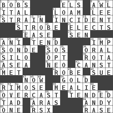 ACROSS 1. Moves up and down 5. Raised railways 8. Leather borer 11. Slanted text style (abbr.) 12. Rich soil 13. Area sheltered from the wind 14. Put through a sieve 17. Event 19. Disco prop 21. Opts 22. Comfort 23. Elected rep. 24. Black tropical American cuckoo 27. Look after 29. Naughty child 32. Message 34. Distress signal 36. Of the mouth 37. Grain storage tower 38. Elect 39. Round or rotation of duties 40. Toward the sea 41. Modern: prefix 42. 2nd pers. sing. pres. of can (arch.) 43. Was introduced to 44. Loose flowing garment 46. Institute legal proceedings 47. At this time 50. Gilt 52. Full of chinks, cracks, or crevices 55. Ear of corn 57. Cloudy 59. Looked after 62. Bit 63. Caspian sea tributary 64. Actor Griffith 65. Single 66. Acura sports coupe 67. Raze (variant) DOWN 1. Altar cloth linen 2. Baseball player Mel 3. Oblong pieces of solid material 4. Chalkboard 5. A really long time 6. Shoestrings 7. Grin 8. Actor Baldwin 9. Left 10. Allows 12. Whopper 15. Feeling or showing extreme anger 16. Characteristic smell of wine 18. Lair 20. Gillaume's butler role 24. Indian state 25. Annoying sound 26. An arm off of a larger body of water 28. Drug addict 29. Metal shackles 30. Taiwanese island in East China Sea 31. Food holder 33. ___ good deed 35. Moe Howard, for one 36. Mouth or opening 42. Cell (Danish) 45. Water vessel 47. And not 48. Witty Wilde 49. Puts on (as clothing) 51. Middle Eastern gold or silver currency 52. Printing process, for short 53. "Terrible" tsar 54. Ancient Persian 55. Mountains (abbr.) 56. Pulitzer Prize-winning author Ferber 58. Saxophone 60. Begley and Asner 61. Color