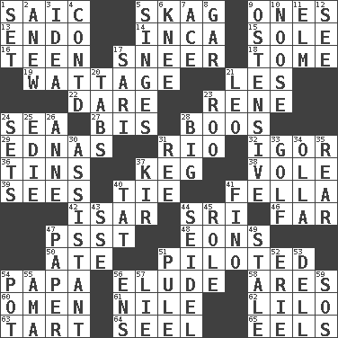 ACROSS 1. Ketch in the Levant 5. Heroin 9. Washington bills 13. Inside; within (prefix) 14. South American Indian 15. Not divided or shared with others 16. Adolescent 17. Scornful expression 18. Heavy book 19. Electrical Measurement 21. French article 22. Have the gumption 23. French philosopher Descartes 24. Ocean 27. Twice 28. Scornful sounds 29. Ferber et al. 31. _ de Janeiro 32. Composer Stravinsky 36. Airtight sealed metal containers 37. Barrel 38. Short-tailed, large-bodied rat 39. Perceives with the eye 40. Make a knot 41. Man or boy (slang) 42. Austrian river, tributary to the Danube 44. _ Lanka 46. Distant 47. Inconspicuous attention getter 48. Immeasurably long periods of time 50. Had dinner 51. Manned the helm 54. Dad 56. Dodge 58. Ancient Greek god of war 60. Sign of things to come 61. "Death on the ____" 62. _ and Stitch 63. Small pie 64. Stitch closed the eyes of (a falcon) 65. Snakelike fish DOWN 1. Put into a specified state 2. Afresh 3. The content of cognition 4. Continued (abbr.) 5. Burns superficially 6. Leg joint 7. Adept person 8. Slender fish 9. Clearly or manifestly demonstrative 10. Trap for birds or small mammals 11. Shade tree 12. Perceive with the eye 17. Indian skirt 20. Bar bills 21. Lion 23. Friend of Pooh 24. Arranges properly for use 25. Singer Brickell 26. Singer Murray 28. Massive 30. Helper 31. To separate or throw off 33. _ course 34. Spanish pot 35. Posterior 37. Apertif with cassis 40. Make lace 41. Fine (Spanish) 43. Compass dir. 44. Beer mug 45. Hero or heavy, e.g. 47. Some stationery 49. Having lost freshness 51. Whine 52. One of the Great Lakes 53. Small valley 54. Plant holder 55. Wet nurse (var.) 56. Followers of ems 57. Whopper 59. Distress signal