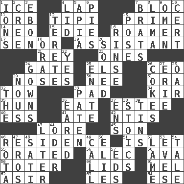 ACROSS 1. Frozen water 4. Infant locale 7. Alliance 11. Globe 12. Native american tent (variation) 13. A-one 14. Modern: prefix 15. Singer Brickell 16. Wanderer 17. Sir (Sp.) 19. Aide 21. Marina Del _, California 23. Singles 24. Yard entry 25. Raised railways 26. Corporate head (abbr.) 29. Olfactory organs 30. Born 31. Mouth or opening 32. Pull behind 33. Groovy apt. 34. Apertif with cassis 35. Attila the _ 36. Ingest 37. First name in cosmetics 40. Curvy letter 41. Had dinner 42. Nuclear Threat Initiatives 43. Old wives' tales, e.g. 45. Manchild 46. Home 51. Small island 55. Declaimed 56. Actor Baldwin 58. Actress Gardner 59. Carrier 60. Flaplike coverings 61. Cartoonist voice _ Blanc 62. SW Saudi Arabia district 63. French article 64. Compass dir. DOWN 1. Charged atoms 2. Algonquian 3. Inky black, to poets 4. Flaplike covering 5. Capital of Western Samoa 6. Sliced desserts 7. Naughty children 8. Pale green bean 9. Sign of something about to happen 10. Foregone conclusion 12. Cylindrical with tapered ends 13. Airs 16. Wash lightly 18. Mouths or openings 20. Having a sole or soles 22. Consenting reply 24. Long dresses 25. Related on the mother's side 26. Popular sodas 27. 4th largest of the Great Lakes 28. Rowing implement 29. Common sense 32. Definite Article 33. Eucharist need 36. Having ears or earlike features 37. Followers of ems 38. Unemotional ones 39. Airtight sealed metal containers 43. 61 cubic inches 44. River in Europe 46. Roll call or roster of names 47. Greek god of love 48. Suttee (variant) 49. Give a ring to 50. Writer Wiesel 52. Unable to walk 53. Nights before holidays 54. Lie 57. Begley and Asner