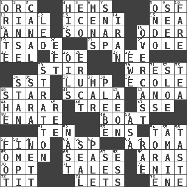 ACROSS 1. The grampus (Milton) 4. Equivocates 8. Order of Saint Francis (abbr.) 11. Monetary unit of Yemen 13. Ancient Celtic tribe of eastern Britain 15. Teachers' org. 16. Queen of England 1702-14 17. Echolocation 18. River in Europe 19. Sadhe (variant) 21. Health resort 22. Grand slam 23. Snakelike fish 24. Enemy 27. Born 29. Use a spoon 30. Take or capture by force 34. Fast jet (abbr.) 36. Mass 39. Learning spot: Fr. 40. Play the lead 41. Any of the three canals of the cochlea 43. Small Philippine buffalo 44. Ethiopian city, capital of Harari 46. Relationship diagram 47. Compass dir. 48. Related on the mother's side 49. Water vessel 51. Nine, plus one 53. Followers of ems 54. Make lace 57. A pale, very dry sherry 60. Cleo's killer 63. Scent 65. Presage 66. Gospel singer Marvin 69. Caspian sea tributary 70. Elect 71. Stories 72. Give off 73. Teat (slang) 74. Allows 75. Compass dir. DOWN 1. Declaim 2. Remove soap 3. Lessep's creation 4. Part of HMS, perhaps 5. Environmental prefix 6. Not women's 7. Fastener 8. Southwest Nigerian state 9. Sew up the eyelids of hawks and falcons 10. Conductor's collection 12. Directed 14. SW Asia republic 18. Cloudy 20. Lizard (obsolete) 25. Petroleums 26. Spew [out] 28. She-sheep 29. Ski resort town in Vermont 31. Immeasurably long periods of time 32. _ gin 33. Afternoon social gathering 34. Comedian Laurel of Laurel & Hardy 35. "Two Mules for Sister ____" 37. Third mo. 38. First-year military academy student 40. A female animal or person 42. Age 45. Portuguese money of account (variant) 50. White ___ sheet 52. Political cartoonist Thomas 54. Singer Mel 55. At full speed 56. Clothes sense 57. One third of a yard 58. Body of Kaffir warriors 59. Remaining after all deductions 61. Lick closed 62. Diluted with white 64. Actress Charlotte 67. Arrange properly for use 68. Curvy letter