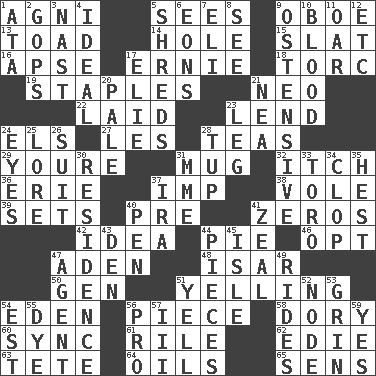 ACROSS 1. Hindu god of fire 5. Observes 9. Mitch Miller's instrument 13. Frog relative 14. Hollow 15. Narrow board 16. Domed church section 17. Bert's buddy 18. Torque (variant) 19. Paper fasteners 21. Modern: prefix 22. Put down 23. Grant temporary use of 24. Raised railways 27. French article 28. Afternoon social gatherings 29. You are 31. Large cup 32. Hankering 36. One of the Great Lakes 37. Mischievous child 38. Grand slam 39. Arranges properly for use 40. Before (prefix) 41. Nothings 42. It may be bright or harebrained 44. Sliced dessert 46. Elect 47. An important port of Yemen 48. Austrian river, tributary to the Danube 50. Commissioned military rank (abbr.) 51. Crying or shouting loudly 54. Paradise 56. Part 58. Rowboat 60. Synchronize (abbr.) 61. Cause heat under the collar 62. Singer Brickell 63. False hair 64. Lubricates 65. Elected reps. DOWN 1. "One Day ___ Time" 2. Republicans 3. Political cartoonist Thomas 4. Standard of perfection 5. Fragments 6. Immeasurably long periods of time 7. Biblical high priest 8. Observe 9. Clearly or manifestly demonstrative 10. Vital fluid 11. Boat paddle 12. And so on (abbr.) 17. Writer Wiesel 20. Light colored 21. Teachers' org. 23. Part of a journey 24. Sight organs 25. Old wives' tales, e.g. 26. Set or collection 28. Uncastrated adult male sheep 30. Home 31. Madame (abbr.) 33. "Corrida" creature 34. Hoof sound 35. Behest 37. Retirement account (abbr.) 40. Animal enclosure 41. Ardor 43. Lair 44. Components 45. Small island 47. Representative 49. Amusement-park features 51. Shout 52. Connecting point 53. Smile widely 54. Eastern Standard Time (abbr.) 55. Color 56. Adept person 57. One more than two 59. It is so