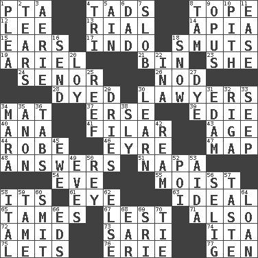 ACROSS 1. Parent Teacher Assoc. 4. Bits 8. Drink excessively 12. Area sheltered from the wind 13. Monetary unit of Yemen 14. Capital of Western Samoa 15. Hearing organs 17. Southeast Asian peninsula 18. Particles of soot 19. Satellite of Uranus 21. Storage container 23. A female animal or person 24. Sir (Sp.) 26. Allow head to fall sleepily 28. Colored 30. Those who practice law 34. Floor protector 37. Celtic language 39. Singer Brickell 40. Santa ___, CA 41. Having threads 43. Personal question 44. Loose flowing garment 46. Jane of fiction 47. Atlas unit 48. Statements in reply to questions 51. California wine valley 54. First lady 55. Wet 58. ___ a Wonderful Life 61. Sight organ 63. Perfect 65. Softens 67. For fear that 71. In addition 72. Among 73. Indian skirt 74. Call ___ day 75. Allows 76. 4th largest of the Great Lakes 77. Commissioned military rank (abbr.) DOWN 1. Entreaty 2. Separates forcefully 3. Nest on high 4. Three (prefix) 5. The 18th letter of the Arabic alphabet 6. June honoree 7. Oscar Madison type 8. Scottish cap 9. Musical composition 10. Essential or central part 11. Relaxation 16. Transmit 18. Frozen precipitation 20. Myrna of the movies 22. _ tizzy (2 wds.) 25. Coral ridge 27. Color 29. Frees from moisture 30. Memorize 31. Dutch treat 32. Capital of Latvia 33. Ooze 34. Hindu Mythology: god of death 35. Soon (poet.) 36. Bar bills 38. Cunning 42. 480, 500 or 516 sheets of paper 45. She-sheep 49. Nights before holidays 50. Marina Del _, California 52. Luau course 53. Opera by Verdi 56. Former Milwaukee Brewers owner Bud 57. Clothes sense 58. Slanted text style (abbr.) 59. Docile 60. Stricken, poetically 62. Otherwise 64. Grant temporary use of 66. Begley and Asner 68. Hearing organ 69. Indian title of respect (Mr.) 70. Neckwear