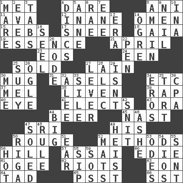 ACROSS 1. Was introduced to 4. Have the gumption 8. Black tropical American cuckoo 11. Actress Gardner 12. Lacking in sense or substance 14. Presage 15. Confederate soldiers (slang) 17. Contemptuous expression 18. Greek goddess of the earth (variant) 19. Substance 21. Showery time 23. Greek goddess of the dawn 24. Car or cant ending 25. Exchanged or delivered for money 27. (Had) reclined 30. Java container 31. Artist's stands 34. And so on (abbr.) 37. Cartoonist voice _ Blanc 38. Make or become more lively 39. Reproach for some lapse or misdeed 40. Sight organ 41. Chooses 43. Mouth or opening 44. Fermented drink made from hops 45. Political cartoonist Thomas 47. Indian title of respect (Mr.) 49. Part of HMS, perhaps 50. Makeup applied to the cheeks 52. Modes 56. Land elevation 57. Slender Brazilian palm 60. Singer Brickell 61. Double curve, resembling the letter S 62. Debaucheries 63. A really long time 64. Bit 65. Inconspicuous attention getter 66. Fast jet (abbr.) DOWN 1. Female horse 2. Nights before holidays 3. Bar bills 4. Plates 5. Singer Murray 6. Actress Charlotte 7. Compass dir. 8. At full speed 9. Famous astronaut Armstrong 10. _ tizzy (2 wds.) 13. Period 14. Legendary monster 16. Sew up the eyelids of hawks and falcons 20. Connecting point 22. Writing instrument 25. Chop _ 26. Stare 27. Crowbar 28. Actor Baldwin 29. Is not 30. Madame (abbr.) 32. Toward shelter 33. Filth; sediment 34. Greek god of love 35. Small pie 36. Accounting whiz (abbr.) 42. In a ____ (agitated or irritated) 44. Large 46. American tennis player Robert 47. Having a sole or soles 48. Court order 49. Robbery 50. Capital of Latvia 51. Hearing organ 52. Floor coverings 53. Lyric poems 54. "Vaya con ____" 55. Emitted 56. Being at a high temperature 58. Small drink 59. Mayday