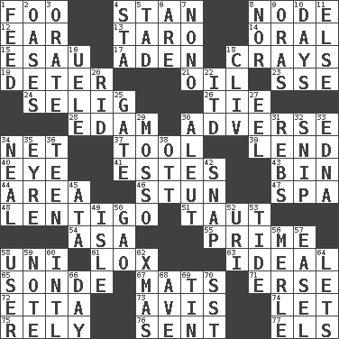 ACROSS 1. Egg _ yung 4. Comedian Laurel of Laurel & Hardy 8. Connecting point 12. Ewer handle 13. Pacific island yam 14. Spoken 15. He sold his birthright 17. An important port of Yemen 18. Trading vessels 19. Prevent from occurring 21. Petroleum 23. Compass dir. 24. Former Milwaukee Brewers owner Bud 26. Standoff 28. Dutch treat 30. Contrary to your interests or welfare 34. Fish or hair follower 37. Utensil 39. Grant temporary use of 40. Sight organ 41. _____ Park, CO 43. Storage container 44. Length times width 46. Surprise greatly 47. Health resort 48. Small, flat, pigmented spot on the skin 51. Strained 54. White ___ sheet 55. First class 58. Corn or form start 61. Brine-cured salmon 63. Standard of perfection 65. Message 67. Floor protectors 71. Celtic language 72. Singer James 73. Advice 74. Allow 75. Depend 76. Transmitted 77. Raised railways DOWN 1. Nourish 2. Fertile tracts in a desert 3. Declaim 4. R.R. building 5. Small boy 6. "We ___ not amused" (Victoria) 7. Words to Nanette 8. Or not 9. Mouths or openings 10. 24-hour periods 11. Otherwise 16. Ubangi River tributary 18. 154 in Roman numerals 20. To free from 22. It would 25. Yard entry 27. Snakelike fish 29. With motion or animation 30. Eskimo relative 31. Confederate soldiers (slang) 32. Sever or remove by pinching or nipping 33. Pulitzer Prize-winning author Ferber 34. Anneal 35. Jane of fiction 36. Adolescent 38. Baseball player Mel 42. Fastener 45. "One Day ___ Time" 49. Capri or Wright 50. E Mali city 52. RI univ. 53. Event that recurs at intervals 56. Haggard of country music 57. Artist's stand 58. One who makes use of a thing 59. Musical sound 60. International (abbr.) 62. Dec. holiday 64. Allows 66. 24 hours 68. "___ Maria" 69. Shallow baking pan 70. Fast jet (abbr.)