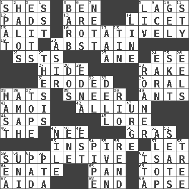 ACROSS 1. "______ My Girl" (Turtles hit) 5. Benjamin's nick name 8. Fails to keep up a pace 12. Writing tablets 13. "We ___ not amused" (Victoria) 14. It is permitted: Lat. 15. Set down 16. Producing rotation 19. Small child 20. Choose not to consume 21. Fast planes 23. A saturated hydrocarbon 24. Compass dir. 27. Flintstone garb 30. Libertine 31. Worn away 34. Taken by mouth 35. Floor protectors 38. Scornful expression 40. Pismires 41. Mine, in Marseilles 42. Plant genus of onion and garlic 44. Plant excrements 45. Old wives' tales, e.g. 46. Definite Article 47. Born 50. Pate de foie ____ 53. Heighten or intensify 57. Allow 59. Supplying deficiencies 63. Austrian river, tributary to the Danube 64. Related on the mother's side 65. Baking dish 66. Carry 67. Opera by Verdi 68. Conclude 69. Domed church section DOWN 1. Petty quarrel 2. Auras 3. Prepares for publication 4. Fast jet (abbr.) 5. Sharp remark 6. Greek god of love 7. Remaining after all deductions 8. 54 in ancient Rome 9. Adept person 10. Set 11. Filthy place 14. Actor's bit 17. Auto club (abbr.) 18. Metal container 20. SW Saudi Arabia district 22. College paper 24. Merit 25. Three-handed card game 26. Snakelike fish 28. Two (Sp.) 29. Pulitzer Prize-winning author Ferber 30. Nomad 32. Snakelike fish 33. Small valley 35. Vertical spar for supporting sails 36. Housemaid 37. Drink excessively 39. River (Sp.) 43. Goad 47. The longest river in the world 48. Compass dir. 49. Eastern Standard Time (abbr.) 51. Columnist Joseph or Stewart 52. Theater features 54. Corncob 55. "Terrible" tsar 56. Tear apart 58. Woody plant 59. Ocean 60. Single; one (prefix) 61. Groovy apt. 62. Parent Teacher Assoc. 63. Call ___ day