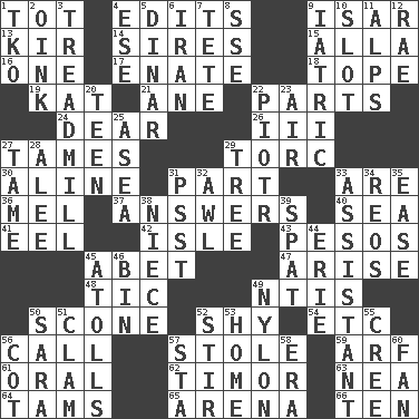 ACROSS 1. Small child 4. Proofreads 9. Austrian river, tributary to the Danube 13. Apertif with cassis 14. Male parents of animals 15. Silent film actress Nazimova 16. Single 17. Maternal 18. Drink excessively 19. Krazy ___ of comics 21. A saturated hydrocarbon 22. Components 24. Letter starter 26. One more than two 27. Domesticates 29. Torque (variant) 30. Place in a line 31. Role in a play 33. "We ___ not amused" (Victoria) 36. Cartoonist voice _ Blanc 37. Replies 40. Ocean 41. Snakelike fish 42. Small island 43. Mexican monetary units 45. Collude with 47. Originate 48. Nervous spasm 49. Nuclear Threat Initiatives 50. Biscuitlike quick bread 52. Like a shrinking violet 54. And so on (abbr.) 56. Give a ring to 57. Fur scarf 59. Sandy's bark 61. Taken by mouth 62. The easternmost of the Lesser Sundas 63. Teachers' org. 64. Scottish caps 65. Sports stadium 66. "___ Little Indians" DOWN 1. Ring climax 2. Pig sound 3. Excercise machine 4. Compass dir. 5. Middle Eastern gold or silver currency 6. SW Asia republic 7. False hair 8. Compass dir. 9. Of or pertaining to medicine 10. Narrow opening 11. High mountains 12. Actress Charlotte 20. Adolescent 22. Peter (Polish) 23. Atmosphere 25. Toward the sea 27. Not wild 28. Toward shelter 29. Family _ (genealogy) 31. Inconspicuous attention getter 32. Leather borer 33. Aide 34. Vintage cars 35. Comfort 38. Sibling's daughter 39. Argument over a trivial matter 44. 4th largest of the Great Lakes 45. Ringlike coral islands and reefs 46. Storage container 49. High-strength synthetic material 50. "Two Mules for Sister ____" 51. Burrowing marine mollusk 52. Use a swizzle stick 53. Dwelling 55. Algonquian 56. Small bed 57. R.R. building 58. Period 60. Air blower