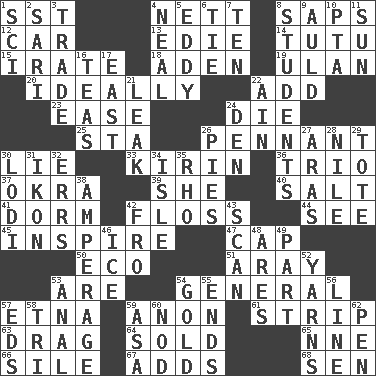 ACROSS 1. Fast jet (abbr.) 4. Remaining after all deductions 8. Plant excrements 12. Auto 13. Singer Brickell 14. Ballerina skirt 15. Feeling or showing extreme anger 18. Arabian gulf 19. Uhlan (variant) 20. Under perfect conditions 22. Say or write further 23. Comfort 24. Expire 25. R.R. building 26. Pre-World Series prize 30. Whopper 33. Japanese brewing company 36. Musical group of three 37. Gumbo ingredient 39. A female animal or person 40. Table seasoning 41. Dormintory (informal) 42. Soft thread for cleaning between teeth 44. Perceive with the eye 45. Motivate 47. Head covering 50. Environmental prefix 51. Like ___ of sunshine 53. "We ___ not amused" (Victoria) 54. Commissioned military rank 57. Inactive volcano in Sicily 59. Soon (poet.) 61. Remove all contents or possession from 63. To draw with force 64. Disposed of to a purchaser 65. Compass dir. 66. Drop; flow; fall 67. Does sums 68. Elected rep. DOWN 1. _-fi 2. Indian skirt 3. Swap 4. Actress Patricia 5. Whirlpool 6. Neckwear 7. Nine, plus one 8. SAT takers 9. Old (Scot.) 10. Parent Teacher Association (abbr.) 11. Player for Phoenix 16. Beverages made from leaves 17. 90 degrees 21. Path through which fluid escapes 22. The 18th letter of the Arabic alphabet 24. Lair 26. Sliced desserts 27. Caspian sea tributary 28. Mediterranean tributary 29. Lug 30. Farming town in central California 31. Image 32. Blunders 34. Capri or Wright 35. 17th letter of the Greek alphabet 38. Electrical Measurement 42. Back 43. Glance over 46. Frozen water 48. Ancient Greek god of war 49. Component 52. Entertaining tales 53. Of or related to the anus 54. Gilded 55. Extremities 56. Actor's bit 57. Begley and Asner 58. Three (prefix) 59. White ___ sheet 60. Dreamland 62. Animal enclosure