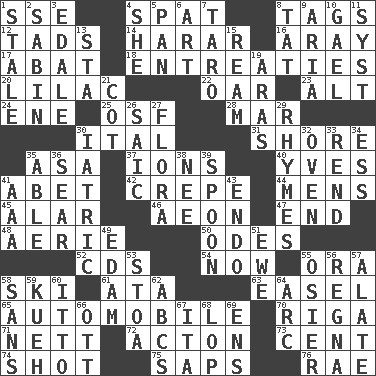 ACROSS 1. Compass dir. 4. Petty quarrel 8. Labels 12. Small amounts or degrees 14. Ethiopian city, capital of Harari 16. Like ___ of sunshine 17. Blind as ____ 18. Pleas 20. Pale purple color 22. Boat paddle 23. The first octave above the treble staff 24. Compass dir. 25. Order of Saint Francis (abbr.) 28. Spoil 30. Slanted text style (abbr.) 31. Dinah or Pauly 35. White ___ sheet 37. Charged particles 40. Jacques Cousteau's middle name 41. Collude with 42. Streamer paper 44. Not women's 45. Having or resembling wings 46. A really long time 47. Conclude 48. Nest on high 50. Lyric poems 52. Music discs 54. At this time 55. Mouth or opening 58. What Jean-Claude Killy likes to do 61. "One Day ___ Time" 63. Artist's stand 65. Form of transportation 70. Port city in Latvia 71. Remaining after all deductions 72. 13-14th century defensive garment 73. Penny 74. Guess 75. Plant excrements 76. Actress Charlotte DOWN 1. Having lost freshness 2. Unit of acoustic absorption 3. Peak District village in England 4. A female animal or person 5. Baking dish 6. Nonscientific branch of learning 7. Pacific island yam 8. Make lace 9. Operatic vocal solo 10. Highlander 11. System (abbr.) 13. R.R. building 15. 480, 500 or 516 sheets of paper 19. Ancient river in northeast Turkey 21. Small bed 26. Ketch in the Levant 27. Plants 29. Poems 30. Of or pertaining to medicine 32. Baking chamber 33. Tear apart 34. Double-curved letter 35. Competent 36. Burn superficially 38. Born 39. Soup utensil 41. Auto club (abbr.) 43. Inside; within (prefix) 49. Dutch treat 51. She-sheep 53. Portico 55. Flexible twig of a willow tree 56. Canadian anthropologist Darnell 57. Having winglike extensions 58. Without 59. Malaysian steamed pastry 60. "Tell ____ the Marines!" 62. Lettered men learn these first 64. Curve 66. Baseball player Mel 67. Call ___ day 68. Trim (branches) 69. Followers of ems