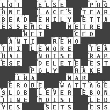 ACROSS 1. Car dealer's back yard 4. Otherwise 8. Adept person 11. Single 12. Shoestrings 14. Lacerate 15. Necklace unit 17. Poet Dickinson 18. Singer James 19. Core 21. Distance measurement (Brit.) 23. Fish or hair follower 24. Corporate head (abbr.) 25. Against 27. San ____ (Riviera town) 30. Three (prefix) 31. Poe poem 34. Afternoon social gathering 37. Actor Linden 38. Annoying sound 39. Hit sharply and swiftly 40. Compass dir. 41. Erase 43. Eastern Standard Time (abbr.) 44. Much (prefix) 45. Immoral or dissolute person 47. Lyricist Gershwin 49. Third mo. 50. Wear away 52. Electrical Measurement 56. Messy guy 57. Crowbar 60. Inky black, to poets 61. Prong on a fork 62. Wet 63. Directed 64. Affirmative reply 65. Puts into a specified state 66. Curvy letter DOWN 1. Ear part 2. Singles 3. Afternoon social gatherings 4. Voters do this 5. Unable to walk 6. _-fi 7. Snakelike fish 8. Stone: prefix 9. Pace 10. Mouth or opening 13. Symbol (abbr.) 14. Wig 16. Gouge 20. Famous astronaut Armstrong 22. Environmental prefix 25. Caspian sea tributary 26. "Death on the ____" 27. Agitated, as a liquid 28. Celtic language 29. Confront 30. Definite Article 32. Inside; within (prefix) 33. Christmas carol 34. Long journey 35. Relaxation 36. Fitting 42. Part of Q.E.F. 44. Groovy apt. 46. Johnson of "Laugh-In" 47. Metal shackles 48. Loose flowing garment 49. Shops 50. Writer Wiesel 51. Shade tree 52. Compass direction 53. Competent 54. Moves 55. Extremities 56. Filthy place 58. Greek goddess of the dawn 59. Compete