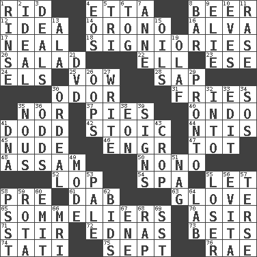 ACROSS 1. To free from 4. Singer James 8. Fermented drink made from hops 12. It may be bright or harebrained 14. U. of Maine site 16. Inventor's middle name 17. Actress Patricia 18. Seigniories (variant) 20. First course 22. Pipe bend 23. Compass dir. 24. Raised railways 25. Promise 28. Plant excrement 30. Scent 31. Strips of potato fried in deep fat 35. And not 37. Sliced desserts 40. Southwest Nigerian state 41. Texas town _ City 42. Unemotional 44. Nuclear Threat Initiatives 45. Unadorned 46. Engineer (abbr.) 47. Small child 48. Indian state 50. Words to Nanette 52. Trim (branches) 54. Health resort 55. Allow 58. Before (prefix) 61. Pat or tap gently 63. Michael Jackson trademark 65. Wine waiters 70. SW Saudi Arabia district 71. Tumult 72. Ferber et al. 73. Stakes 74. Jacques of French films 75. Back-to-school mo. 76. Actress Charlotte DOWN 1. Wash lightly 2. Standard of perfection 3. Allots cards 4. Greek goddess of the dawn 5. Three (prefix) 6. Coat; cloak 7. Queen of England 1702-14 8. Tavern 9. Writer Wiesel 10. Nights before holidays 11. Raze (variant) 13. Wing 15. Lubricates 19. Norwegian king 21. Movie disc 26. I made a mistake 27. Compose 29. Right away 30. Severe or trying experience 32. To the inside or interior of 33. Prepare for publication 34. Mayday 35. Horse sense 36. Probability 38. Period of immesurable duration 39. Public displays of written messages 41. Heredity factor (abbr.) 43. Riding implement 49. Method 51. Tired old horse 53. Light colored 55. Failure 56. Webber/Rice musical 57. Laconic 58. Inconspicuous attention getter 59. Roll call or roster of names 60. Send forth 62. Auction offers 64. Experiment locale 66. Medical imaging device (abbr.) 67. Compass dir. 68. Strike 69. Fast jet (abbr.)