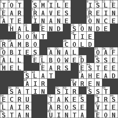 ACROSS 1. Small child 4. Grin 9. Capri or Wright 13. Ewer handle 14. All-night dance parties 15. It's straight from the horse's mouth 16. Had dinner 17. Silly 18. At one time in the past 19. Actor Linden 21. Conclusion 22. Message 24. Do not 26. Neckwear 27. Role for Stallone 29. Lacking warmth 30. Off-Broadway awards 31. Of or related to the anus 33. Clumsy lout 36. 100% 37. Turned at an angle; bent 40. Compass dir. 41. Cartoonist voice _ Blanc 42. Hearing organs 43. First name in cosmetics 45. Narrow board 47. Toward the future 48. Wind 49. Songbird 50. Smooth fabric 52. Title for a knight 54. Fast jet (abbr.) 56. Shade of tan 57. Proceeds 59. Big collection agency 61. Den 62. Came up 63. Compete 64. Comedian Laurel of Laurel & Hardy 65. National forest in Provo, Utah 66. Period of immesurable duration DOWN 1. Afternoon social gathering 2. Pledge 3. Excercise machine 4. _ Lanka 5. French painter Edouard 6. "Terrible" tsar 7. Grant temporary use of 8. Compass dir. 9. Pressed 10. Post 11. Louse (plural) 12. Compass dir. 20. Ear part 22. Fur scarf 23. Petroleum 25. Olfactory organ 27. Wander 28. Competent 29. Crow sounds 31. Blind as ____ 32. Not either 33. Clearly or manifestly demonstrative 34. At sea 35. Nourish 38. Memorize 39. Letter starter 44. "______ My Girl" (Turtles hit) 45. Titan orbits this 46. Cards in a Roman deck? 49. Obtain by seizing forcibly or violently 50. Go away! 51. Roberta Peters solo 52. Indian skirt 53. Image 55. Musical group of three 56. Raised railways 57. The 19th letter of the Greek alphabet 58. Ocean 60. Elected rep.