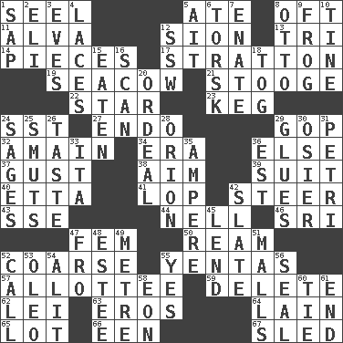ACROSS 1. Sew up the eyelids of hawks and falcons 5. Had dinner 8. Often (poetically) 11. Inventor's middle name 12. The Jewish people; Israel 13. Three (prefix) 14. Components 17. Ski resort town in Vermont 19. Manatee 21. Moe Howard, for one 22. Play the lead 23. Cask 24. Fast jet (abbr.) 27. Inside; within (prefix) 29. Republican Party 32. With great haste 34. Period 36. Otherwise 37. Abrupt rush of wind 38. Direct toward a target or goal 39. Set or collection 40. Singer James 41. Trim (branches) 42. Guide 43. Compass dir. 44. 1994 drama film starring Jodie Foster 46. _ Lanka 47. Opposite of masc. 50. 480, 500 or 516 sheets of paper 52. Rough 55. Gossips 57. One to whom something is allotted 59. Keyboard key 62. Luau accessory 63. Greek god of love 64. (Had) reclined 65. Car dealer's back yard 66. Car or cant ending 67. Downhill vehicle DOWN 1. Plant excrement 2. Connecticut Ivy Leaguer 3. Nights before holidays 4. Shoestrings 5. Small island 6. Cod relative 7. Maternal 8. Von Bismarck 9. Toadlike animal 10. Prong on a fork 12. Compass dir. 15. Consumed 16. Skim 18. Coat; cloak 20. Severe or trying experience 24. Gurus 25. Obscenities 26. Clothes sense 28. Constellation of myth 29. Cements 30. Flexible twig of a willow tree 31. _ dish (used to culture cells) 33. Call ___ day 35. Electrical Unit 36. Eastern Standard Time (abbr.) 42. Schedule 45. Grant temporary use of 47. Back 48. First name in cosmetics 49. Distance measurement (Brit.) 51. Shopping centers 52. Give a ring to 53. Margarine 54. Came down and settled, as after flight 55. Affirmative reply 56. Lick closed 58. Period of immesurable duration 60. Neckwear 61. Conclusion