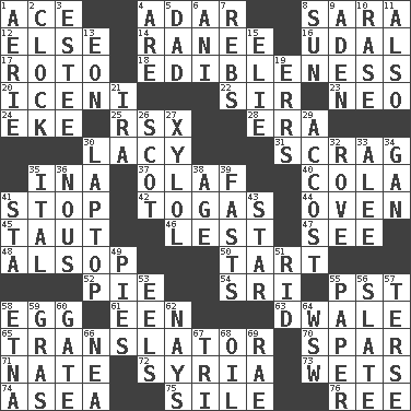 ACROSS 1. Adept person 4. The sixth month of the Jewish calendar 8. "Two Mules for Sister ____" 12. Otherwise 14. The wife of a rajah (variant) 16. Hereditary estate 17. Printing process, for short 18. The property of being fit to eat 20. Ancient Celtic tribe of eastern Britain 22. Title for a knight 23. Modern: prefix 24. Make supply last 25. Acura sports coupe 28. Period 30. Made of lace 31. Lean end of the neck 35. _ tizzy (2 wds.) 37. Norwegian king 40. Root beer relative 41. Close up, plug up 42. Ancient Roman robes 44. Baking chamber 45. Drawn tight 46. For fear that 47. Observe 48. Columnist Joseph or Stewart 50. Small pie 52. Sliced dessert 54. Indian title of respect (Mr.) 55. Pacific Standard Time (abbr.) 58. Ovum 61. Car or cant ending 63. A sleeping potion; an opiate (poet.) 65. Interpreter 70. Practice fight 71. Nathan's nickname 72. Damascus' land 73. Soaks 74. At sea 75. Filth; sediment 76. Portuguese money of account (variant) DOWN 1. Nest on high 2. Timepiece 3. First name in cosmetics 4. "We ___ not amused" (Victoria) 5. June honoree 6. Black tropical American cuckoo 7. Confederate soldiers (slang) 8. Player for Phoenix 9. An important port of Yemen 10. To erase 11. In addition 13. Period of immesurable duration 15. Writer Wiesel 19. Blunders 21. Retirement account (abbr.) 26. Native of Scotland 27. Xylene (variant) 29. Buttonhole 30. Portable computer 32. Be footloose 33. Toward shelter 34. Separate the seeds from cotton 35. Slanted text style (abbr.) 36. Good sense 38. Ripen 39. Goes without food and/or water 41. R.R. building 43. Play the lead 49. Sliced desserts 51. To free from 53. Snakelike fish 55. Some stationery 56. Chalkboard 57. Laconic 58. Inactive volcano in Sicily 59. Pate de foie ____ 60. Yard entry 62. Negative votes 64. Compass dir. 66. Teachers' org. 67. Three (prefix) 68. Petroleum 69. Actress Charlotte