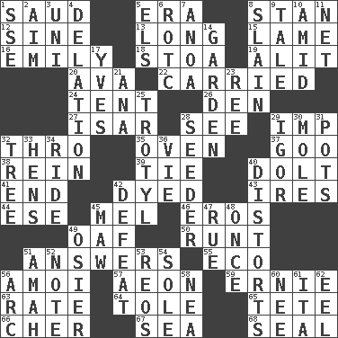 ACROSS 1. Saudi Arabian king (1953-1964) 5. Epoch 8. Comedian Laurel of Laurel & Hardy 12. Trig term 13. Yearn 15. Unable to walk 16. Poet Dickinson 18. Portico 19. Came down and settled, as after flight 20. Actress Gardner 22. Borne 24. Portable shelter 26. Lair 27. Austrian river, tributary to the Danube 28. Perceive with the eye 29. Naughty child 32. Through, poetically 35. Baking chamber 37. Thick or sticky substance 38. It's straight from the horse's mouth 39. Neckwear 40. Stupid person 41. Conclusion 42. Colored 43. Angers 44. Compass dir. 45. Cartoonist voice _ Blanc 46. Greek god of love 49. Clumsy lout 50. The smallest animal of a litter 51. Responds (to) 55. Environmental prefix 56. Mine, in Marseilles 57. A really long time 59. Bert's buddy 63. Assign a rank or rating to 64. Lacquered or enameled metalware 65. Wig 66. "Mermaids" star 67. Ocean 68. Lick closed DOWN 1. Compass dir. 2. Direct toward a target or goal 3. Single; one (prefix) 4. Accusation by an informer 5. Raised railways 6. College mil. group 7. Small Philippine buffalo 8. Killed 9. Falsehood 10. Among 11. Fish or hair follower 14. Place where plants grow 17. Jacques Cousteau's middle name 21. Santa ___, CA 23. To sift 25. TNT 28. Sowing specialist 29. Russian composer Stravinsky 30. Undercover agent 31. Plant holders 32. Family _ (genealogy) 33. Coop moms 34. Travel on an animal 36. Compete 40. What propaganda does 42. Outscore 45. Informal term for the mouth 47. Regret 48. Single time 49. Flexible twig of a willow tree 51. Housemaid 52. Observe 53. Vintage cars 54. Not divided or shared with others 56. Curve 58. Teachers' org. 60. Born 61. Call ___ day 62. Snakelike fish