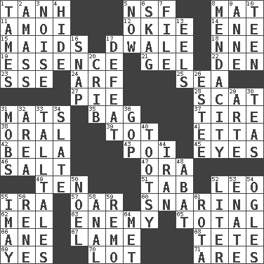 ACROSS 1. Hyperbolic tangent 5. Overdraft (abbr.) 8. Floor covering 11. Mine, in Marseilles 12. Migrant worker of the '30s 14. Compass dir. 15. Unmarried girls 17. A sleeping potion; an opiate (poet.) 18. Compass dir. 19. Substance 21. Set 22. Lair 23. Compass dir. 24. Sandy's bark 25. Ocean 27. Sliced dessert 28. Go away! 31. Floor protectors 35. Paper or plastic container 37. Become fatigued 38. Spoken 39. Small child 41. Singer James 42. Actor Lugosi 43. Luau course 45. Snake ____ (dice throw) 46. Table seasoning 47. Mouth or opening 49. "___ Little Indians" 51. Keyboard key 52. Lion 55. Lyricist Gershwin 57. Rowing implement 60. Catching in a trap 62. Cartoonist voice _ Blanc 63. Foe 65. "_____ Recall" 66. A saturated hydrocarbon 67. Unable to walk 68. Wig 69. Consenting reply 70. Car dealer's back yard 71. Ancient Greek god of war DOWN 1. Domesticates 2. Collect or gather 3. Annoying sound 4. Flintstone garb 5. Immediately 6. Heroin 7. Do some clerical work 8. Ananias' fault 9. Singer Murray 10. Adolescent 13. Snakelike fish 16. Fastener 17. Outscore 20. Baby bed with high sides 26. First name in cosmetics 29. Johnson of "Laugh-In" 30. Beverages made from leaves 31. Crowds into 32. Type of rug 33. Baron Munchausen's specialties 34. Schedule 36. Grand Old Party 40. Tootsie (variant) 44. SW Asia republic 48. Blind as ____ 50. Christmas carol 52. 61 cubic inches 53. Related on the mother's side 54. Stares at amorously 55. "If ____ say so..." 56. French philosopher Descartes 58. Of or related to the anus 59. San ____ (Riviera town) 61. Roll call or roster of names 64. Was introduced to