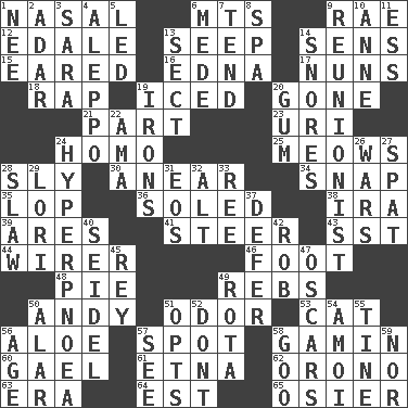 ACROSS 1. Relating to the nose 6. Mountains (abbr.) 9. Actress Charlotte 12. Peak District village in England 13. Ooze 14. Elected reps. 15. Having ears or earlike features 16. Pulitzer Prize-winning author Ferber 17. Religious women 18. Strike 19. On the rocks 20. Went 21. Piece 23. RI univ. 24. Same (prefix) 25. Catcalls? 28. Stealthy 30. Approach 34. Fastener 35. Chop off 36. Having a sole or soles 38. Lyricist Gershwin 39. Ancient Greek god of war 41. Bull 43. Fast jet (abbr.) 44. One who wires 46. Pick up the tab 48. Sliced dessert 49. Confederate soldiers (slang) 50. Actor Griffith 51. Aroma 53. Domesticated feline 56. _ vera 57. Specific locale 58. Homeless child 60. Highlander 61. Inactive volcano in Sicily 62. U. of Maine site 63. Epoch 64. Eastern Standard Time (abbr.) 65. Flexible twig of a willow tree DOWN 1. Born 2. The sixth month of the Jewish calendar 3. "Two Mules for Sister ____" 4. City in Syria 5. Directed 6. Ancient Persian 7. Look after 8. Health resort 9. One who advocates reunion 10. Singer Murray 11. Curvy letter 13. Religious group 14. Sounds asleep 19. Metal shackles 20. Chewing product 22. Nursemaid (var.) 24. Abnormally rapid or deep breathing 26. Armed conflicts 27. Argument over a trivial matter 28. Cole _ (cabbage dish) 29. Australian parrot (variant) 31. Greek goddess of the dawn 32. The first octave above the treble staff 33. To separate or throw off 37. Put off 40. A glass for beer 42. Director Reiner 45. Marina Del _, California 47. Motion picture awards 49. Round or rotation of duties 50. Having or resembling wings 51. Elects 52. Do not 54. Mine, in Marseilles 55. Prong on a fork 56. Ripen 57. Perceive with the eye 58. Thick or sticky substance 59. Not either