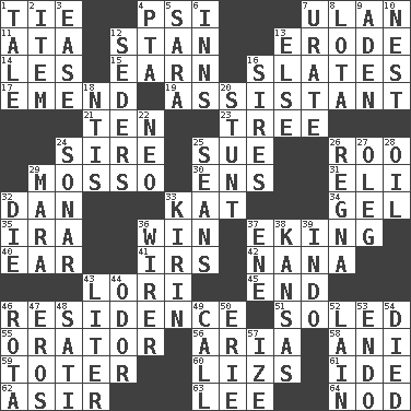 ACROSS 1. Make a knot 4. 23rd letter of the Greek alphabet 7. Uhlan (variant) 11. _ moment's notice (2 wds.) 12. Comedian Laurel of Laurel & Hardy 13. Eat (away) 14. French article 15. Merit 16. Chalkboards 17. Make improvements or corrections to 19. Aide 21. "___ Little Indians" 23. Family _ (genealogy) 24. The founder of a family 25. Take to court 26. Friend of Pooh 29. With motion or animation 30. Followers of ems 31. Biblical high priest 32. One of the 12 tribes of Israel 33. Krazy ___ of comics 34. Set 35. Lyricist Gershwin 36. Victory 37. Supplementing with great effort 40. Ewer handle 41. Big collection agency 42. Grandmother 43. Australian parrot (variant) 45. Conclude 46. Home 51. Having a sole or soles 55. Speaker 56. Roberta Peters solo 58. Black tropical American cuckoo 59. Carrier 60. Belonging to Elizabeth 61. Binary compound 62. SW Saudi Arabia district 63. Area sheltered from the wind 64. Lower and raise head in agreement DOWN 1. Story 2. A distinct part 3. Relaxation 4. Parent Teacher Association (abbr.) 5. "Two Mules for Sister ____" 6. Restaurants 7. A salt of uric acid 8. Globular water bottle used in Asia 9. Arabian gulf 10. Egg locale 12. Spring feasts 13. Otherwise 16. Founders of families 18. Nuclear Threat Initiatives 20. Check the growth or development of 22. Modern: prefix 24. Underwater navigation system 25. Seines 26. Rain (Swedish) 27. Cassini of fashion 28. Petroleum 29. Hindu Mythology: god of death 32. Pass on 33. Japanese brewing company 36. One who wires 37. Compass dir. 38. Sunflower state 39. _ china 43. 61 cubic inches 44. Aroma 46. Round or rotation of duties 47. Greek god of love 48. Suttee (variant) 49. Give a ring to 50. 4th largest of the Great Lakes 52. (Had) reclined 53. Inside; within (prefix) 54. Passed on 57. Ending with capital