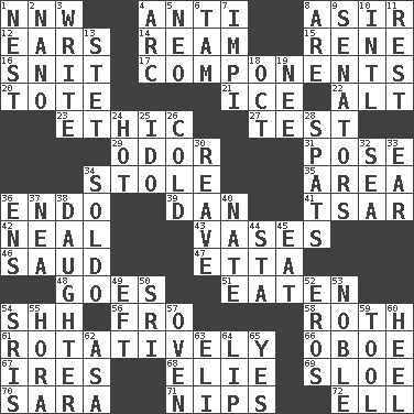 ACROSS 1. Compass dir. 4. Against 8. SW Saudi Arabia district 12. Hearing organs 14. 480, 500 or 516 sheets of paper 15. French philosopher Descartes 16. In a ____ (agitated or irritated) 17. Parts 20. Haul 21. Frozen water 22. The first octave above the treble staff 23. Moral principle 27. Trial 29. Scent 31. Airs 34. Took without asking 35. Type of rug 36. Inside; within (prefix) 39. One of the 12 tribes of Israel 41. Russian ruler of old 42. Be tempered by heat 43. Flower holders 46. Saudi Arabian king (1953-1964) 47. Singer James 48. Leaves 51. Consumed 54. Quiet! 56. From 58. Writer of Portnoy's Complaint (1969) 61. Rotating or pertaining to rotation 66. Mitch Miller's instrument 67. Angers 68. Writer Wiesel 69. A type of plum 70. "Two Mules for Sister ____" 71. Pinches, bites 72. Pipe bend DOWN 1. Egg locale 2. Billionth: prefix 3. Compose 4. Curve 5. Modern: prefix 6. Scottish cap 7. Body of Kaffir warriors 8. "We ___ not amused" (Victoria) 9. Legislators 10. International (abbr.) 11. Take ten 13. Proofreading order 18. Sep. follower 19. Born 24. Being at a high temperature 25. Wedding promise 26. Chilled 28. Arguments over trivial matters 30. Break or tear apart 32. Ocean 33. Ewer handle 34. Twentieth part of a lira 36. Followers of ems 37. Teachers' org. 38. Female child 40. Nathan's nickname 44. R.R. building 45. Consume 49. Bank Draft (abbr.) 50. _ Lanka 52. Greek god of love 53. Impressive in appearance 54. Indian titles of respect 55. Israeli folk dance 57. Baking chamber 59. Instrument 60. Person who is morally reprehensible 62. White ___ sheet 63. Connecticut Ivy Leaguer 64. Mouth edge 65. Consenting reply