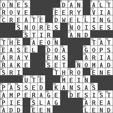 ACROSS 1. Washington bills 5. Daniel's nick name 8. Keyboard modifier key 11. Be footloose 12. Suggestive of the supernatural 13. By way of 14. Make 17. Home 19. Sounds asleep 21. Annoying sounds 22. Commotion 23. Plus 24. Definite Article 27. Age 29. Make lace 32. Artist's stand 34. ___ good deed 36. Republicans 37. Like ___ of sunshine 38. Followers of ems 39. Roberta Peters solo 40. Libertine 41. Arrange properly for use 42. Wanderer 43. _ Lanka 44. Through, poetically 46. Compass dir. 47. Shoshoni 50. Chow _ 52. Went by 55. Sunflower state 57. Electrical Measurement 59. Stop 62. Sliced dessert 63. Volcanic refuse 64. Length times width 65. Find the sum of 66. Car or cant ending 67. Grant temporary use of DOWN 1. The grampus (Milton) 2. And not 3. Nights before holidays 4. Actors Connery and Penn 5. Morning condensation 6. Sports stadium 7. High-strength synthetic material 8. Deliberation 9. Actor's bit 10. Labels 12. Begley and Asner 15. Add up to 16. 4th largest of the Great Lakes 18. Hat (slang) 20. Eats (away) 24. Lacerates 25. Ethiopian city, capital of Harari 26. 1973 Nobel Price Winner (Physics) Leo 28. Music written for nine 29. Singer Mel 30. Bee-related 31. Sadhe (variant) 33. Sight organ 35. Respiratory problem 36. E Mali city 42. Annoying sound 45. Tear apart 47. Purpose 48. Laconic 49. Peak District village in England 51. Rhinal 52. Dad 53. Among 54. Broke a traffic law 55. Cask 56. Male parent of an animal 58. Separate the seeds from cotton 60. Elected rep. 61. Bit