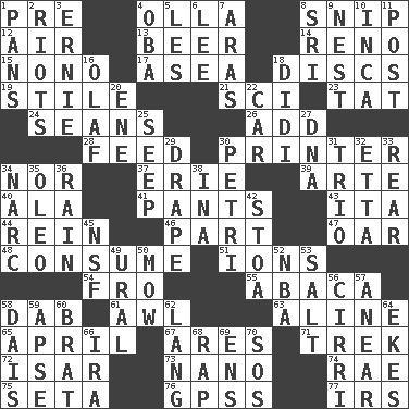 ACROSS 1. Before (prefix) 4. Spanish pot 8. Sever or remove by pinching or nipping 12. Atmosphere 13. Fermented drink made from hops 14. Western Nevada city 15. Words to Nanette 17. Toward the sea 18. Flat circles 19. Vertical member of a panel or frame 21. _-fi 23. Make lace 24. Actors Connery and Penn 26. Increase 28. Nourish 30. Hard copy producer 34. Or not 37. One of the Great Lakes 39. Johnson of "Laugh-In" 40. In the manner of 41. Leg coverings 43. Call ___ day 44. It's straight from the horse's mouth 46. Role in a play 47. Boat paddle 48. Ingest 51. Charged particles 54. Back 55. Phillipine bananalike plant 58. Pat or tap gently 61. Leather borer 63. Place in a line 65. Showery time 67. Ancient Greek god of war 71. Long journey 72. Austrian river, tributary to the Danube 73. Billionth: prefix 74. Actress Charlotte 75. Bristle 76. Global Positioning Systems (abbr.) 77. Big collection agency DOWN 1. Zero-star reviews 2. Disturbances 3. Bert's buddy 4. Chief or king in Benin or Nigeria 5. French article 6. Area sheltered from the wind 7. Ancient river in northeast Turkey 8. Indian title of respect (Mr.) 9. A home for chicks 10. South American Indian 11. Mail 16. Norwegian king 18. "You Light Up My Life" star Conn 20. Compass dir. 22. Auto 25. Ooze 27. Heredity factor (abbr.) 29. Window treatment 30. _ dish (used to culture cells) 31. Musical group of three 32. Singer James 33. Rump 34. Drug cop 35. Butter sub 36. Water falling in drops from the sky 38. _ tizzy (2 wds.) 42. Portico 45. Science/research agcy. 49. Mountain range 50. Cut the grass 52. Basketball assoc. 53. Table seasoning 56. High-altitude cloud 57. Approach 58. Raised platform 59. Domed church section 60. Naughty child 62. Austrian-born American filmmaker Fritz 64. Supplements with great effort 66. Lyricist Gershwin 68. Hit sharply and swiftly 69. Followers of ems 70. Mayday