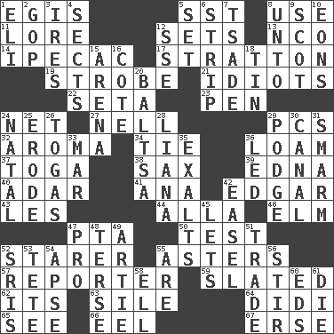 ACROSS 1. The front part of a cuirass 5. Fast jet (abbr.) 8. Purpose 11. Old wives' tales, e.g. 12. Puts into a specified state 13. Non-commissioned officer (abbr.) 14. Medicinal drug used to evoke vomiting 17. Ski resort town in Vermont 19. Disco prop 21. Foolish or stupid persons 22. Stalk of a moss capsule 23. Animal enclosure 24. Fish or hair follower 27. 1994 drama film starring Jodie Foster 29. Personal Computers (abbr.) 32. Odor 34. Neckwear 36. Rich soil 37. Ancient Roman robe 38. Saxophone 39. Pulitzer Prize-winning author Ferber 40. The sixth month of the Jewish calendar 41. Santa ___, CA 42. _ Allan Poe 43. French article 44. Silent film actress Nazimova 46. Shade tree 47. Parent Teacher Assoc. 50. Trial 52. A viewer who gazes fixedly 55. Michaelmas daisies 57. News announcer 59. Scheduled 62. ___ a Wonderful Life 63. Drop; flow; fall 64. "You Light Up My Life" star Conn 65. Perceive with the eye 66. Snakelike fish 67. Celtic language DOWN 1. Connecticut Ivy Leaguer 2. Grand Old Party 3. Angers 4. Religious groups 5. Put into a specified state 6. Long narrow piece of something 7. Sadhe (variant) 8. To (old English) 9. Highlander 10. Immeasurably long periods of time 12. Compass dir. 15. Sports stadium 16. ____ d'Azur (French Riviera) 18. Shallow baking pan 20. Greek mezzo-soprano Agnes 24. Brizilian seaport 25. Wear away 26. Ancient Roman robes 28. Woody, climbing, usually tropical plant 29. Porridge 30. Lessep's creation 31. Excessive but superficial compliments 33. Impair 35. Glorifies 36. Directed 42. Artist's stand 45. Allows 47. Adept person 48. Laconic 49. Nick name for Arthur 51. Exchange 52. Indian titles of respect 53. False hair 54. Domed church section 55. "We ___ not amused" (Victoria) 56. Use a spoon 58. Pipe bend 60. Begley and Asner 61. Pass on