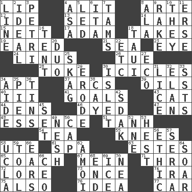 ACROSS 1. Mouth edge 4. Set down 8. Johnson of "Laugh-In" 12. Binary compound 13. Bristle 14. Cowardly lion portrayer 15. Remaining after all deductions 17. First man 18. Receives possession of 19. Having ears or earlike features 21. Ocean 23. Sight organ 24. "_ and Lucy" (Charlie Brown theme song) 26. Third day of the wk. 28. Casino tip 30. Winter's stalactites 34. Fitting 37. Arches 39. Petroleums 40. One more than two 41. Scores awarded for successful feats 43. Domesticated feline 44. Cub Scout units 46. Colored 47. Followers of ems 48. Gist 51. Hyperbolic tangent 54. Afternoon social gathering 55. Leg joints 58. Shoshoni 61. Health resort 63. _____ Park, CO 65. Team commander 67. Chow _ 71. Through, poetically 72. Old wives' tales, e.g. 73. Single time 74. Retirement account (abbr.) 75. In addition 76. The main thing one is thinking about 77. Automobile DOWN 1. Actor's bit 2. Perfect 3. _ dish (used to culture cells) 4. White ___ sheet 5. Directed 6. Call ___ day 7. Scottish caps 8. Insect wing 9. Immoral or dissolute person 10. Those people 11. Celtic language 16. Portable shelter 18. "Change" in Tahitian 20. Superhero pair 22. And so on (abbr.) 25. Heroin 27. Environmental prefix 29. Eat (away) 30. Small island 31. Louse (plural) 32. Flair 33. Fast planes 34. Helper 35. Sliced desserts 36. Metal containers 38. Island 42. Neighbor of Neb. 45. Arrange properly for use 49. Delicate 50. Head covering 52. Compass dir. 53. Behest 56. Principle of right and wrong 57. Father Junipero _ 58. Southern CA. univ. 59. Implement 60. Hearing organs 62. Mine, in Marseilles 64. Fly high 66. Corporate head (abbr.) 68. Conclude 69. Frozen water 70. Teachers' org.