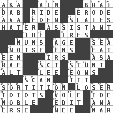 ACROSS 1. Alias (abbr.) 4. Direct toward a target or goal 7. Naughty child 11. Small moist lump or mass 12. Travel on an animal 13. Eat (away) 14. Actress Gardner 15. Locale of original sin 16. Chalkboards 17. Mother 19. Helper 21. Third day of the wk. 23. Angers 24. Religious women 25. Mature 26. Ocean 29. Annoying sound 30. Followers of ems 31. Erode 32. Car or cant ending 33. Big collection agency 34. White ___ sheet 35. Actress Charlotte 36. _-fi 37. Difficult or unusual or dangerous feat 40. Keyboard modifier key 41. Area sheltered from the wind 42. Immeasurably long periods of time 43. Glance over 45. Teat (slang) 46. Decision 51. Failure 55. Foolish or stupid persons 56. Short-tailed, large-bodied rat 58. Binary compound 59. Impressive in appearance 60. Prepare for publication 61. Santa ___, CA 62. Celtic language 63. Born 64. Impair DOWN 1. First of billions? 2. Polynesian shrub of the pepper family 3. Blind as ____ 4. Help 5. It may be bright or harebrained 6. Not women's 7. Naughty children 8. Round or rotation of duties 9. An important port of Yemen 10. Trial 12. Summer TV shows 13. Otherwise 16. Begets 18. Needle case 20. Attaches a signature 22. Compass dir. 24. Music written for nine 25. Nest on high 26. Seines 27. 90 degrees 28. "One Day ___ Time" 29. Be tempered by heat 32. Period 33. Ancient Celtic tribe of eastern Britain 36. Narrow boards 37. Arrange properly for use 38. Bathroom plumbing fixture 39. To (old English) 43. Took without asking 44. Quote 46. Trig term 47. Scent 48. Chest bones 49. Baking chamber 50. Connecting point 52. Thailand, formerly 53. Pulitzer Prize-winning author Ferber 54. Rump 57. Untruth