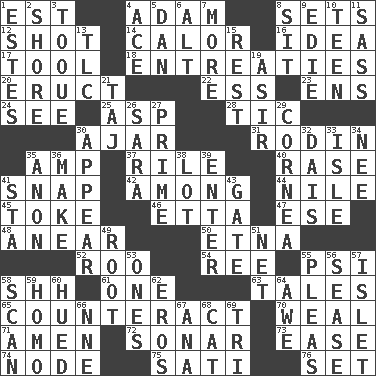 ACROSS 1. Eastern Standard Time (abbr.) 4. First of billions? 8. Puts into a specified state 12. Opportunity 14. Bodily heat indicating an inflammation 16. The content of cognition 17. Instrument 18. Pleas 20. Spew [out] 22. Double-curved letter 23. Followers of ems 24. Perceive with the eye 25. Cleo's killer 28. Nervous spasm 30. Partly open 31. "The Thinker" sculptor 35. Electrical Unit 37. Cause heat under the collar 40. To erase 41. Fastener 42. Amid 44. Mediterranean tributary 45. Puff or smoke 46. Singer James 47. Compass dir. 48. Approach 50. Inactive volcano in Sicily 52. Friend of Pooh 54. To riddle 55. Air pressure measure (abbr.) 58. Quiet! 61. Single 63. Stories 65. Frustrate 70. Welt 71. So be it 72. Echolocation 73. Comfort 74. Connecting point 75. Suttee (variant) 76. Arrange properly for use DOWN 1. _____ Park, CO 2. Dinah or Pauly 3. Woman's close-fitting hat 4. Adept person 5. Daniel's nick name 6. Keyboard modifier key 7. Greater amount 8. Be seated 9. Singer Brickell 10. Adolescent 11. Backtalk 13. Affectionate concern, for short 15. Relief 19. SW Saudi Arabia district 21. _ Mahal 26. "Two Mules for Sister ____" 27. A-one 29. Pupil covering 30. Seem 32. Raised platform 33. Small island 34. Born 35. Soon (poet.) 36. Cause to be 38. Car dealer's back yard 39. Keyboard key 41. R.R. building 43. Yard entry 49. Carrot, for example 51. Fish or hair follower 53. Singles 55. Entreaties 56. Gospel singer Marvin 57. Small island 58. Examine hastily 59. Like (prefix) 60. Took on color 62. Greek god of love 64. Deep reverence 66. Compass dir. 67. Santa ___, CA 68. Feline 69. Three (prefix)