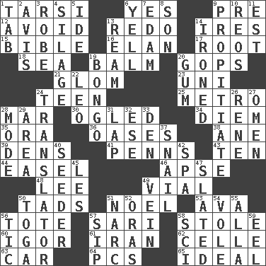 ACROSS 1. Tarsus (plural) 6. Consenting reply 9. Before (prefix) 12. Prevent from happening 13. Redecorate 14. Angers 15. Instruction Manual for Humans 16. Flair 17. Carrot, for example 18. Ocean 19. Lip ointment 20. Republicans 21. Take by theft 23. University (slang) 24. Adolescent 25. Paris' subway 28. Make imperfect 30. Stared 34. South Vietnam president (1954) 35. Mouth or opening 36. Fertile tracts in a desert 38. One (Scot) 39. Habitations of wild animals 41. Actor Sean's family 43. "___ Little Indians" 44. Artist's stand 46. Domed church section 48. Area sheltered from the wind 49. Small bottle 50. Small boys 51. Christmas carol 53. Actress Gardner 56. Carryall 57. Indian skirt 58. Took without asking 60. Russian composer Stravinsky 61. SW Asia republic 62. Cell (Danish) 63. 4-wheeled motor vehicle 64. Personal Computers (abbr.) 65. Perfect DOWN 1. Bar bill 2. Deliberation 3. Loose flowing garment 4. Fodder prepared in a silo 5. Binary compound 6. Shout 7. Dutch treat 8. Male offspring 9. Appease 10. Vintage cars 11. Eastern Standard Time (abbr.) 13. 480, 500 or 516 sheets of paper 14. Pressed 19. Beat drum 20. Chewing product 22. Lion 24. Interpreter 26. French philosopher Descartes 27. Presage 28. Method 29. Type of rug 31. Pet locale 32. Compass dir. 33. Lair 37. Slow-paced one 40. Sowing specialist 42. Health resort 45. French article 47. Scheduled 49. Distinctive style or manner 50. Ancient Roman robe 51. Drug cop 52. Mouths or openings 54. Grand slam 55. Silent film actress Nazimova 56. Nervous spasm 57. Small drink 58. _-fi 59. Snakelike fish