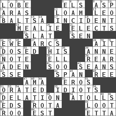 ACROSS 1. Ear part 5. Raised railways 8. Cleo's killer 11. Caspian sea tributary 12. Rich soil 13. Lion 14. Greek mezzo-soprano Agnes 17. Event 19. Ear of corn 21. Opts 22. Narrow board 23. Elected rep. 24. She-sheep 27. Arches 29. Small island 32. Administered medicine 34. Part of HMS, perhaps 36. Queen of England 1702-14 37. Observe 38. Pipe bend 39. Tail end 40. Arabian gulf 41. "Barney Miller" actor Jack 42. Seines 43. Compass dir. 44. Connect, as a bridge 46. To sift 47. Wet nurse (var.) 50. Greek god of love 52. Declaimed 55. Foolish or stupid persons 57. Conveyance 59. Ringlike coral islands and reefs 62. Begley and Asner 63. Round or rotation of duties 64. Spoils 65. Friend of Pooh 66. Eastern Standard Time (abbr.) 67. Singer James DOWN 1. Experiment locale 2. Mouth or opening 3. Lip ointment 4. _____ Park, CO 5. A really long time 6. Shoestrings 7. Grin 8. Actor Baldwin 9. Transmitted 10. Cooking vessels 12. Whopper 15. Vegetable dish 16. Having or resembling wings 18. Lair 20. Irritating cutaneous sensations 24. Ferber et al. 25. Forest 26. First name in cosmetics 28. Grain storage towers 29. Approach 30. Lacking in sense or substance 31. Laconic 33. Car or cant ending 35. Slanted 36. "We ___ not amused" (Victoria) 42. Snout, nose 45. Roberta Peters solo 47. _ moment's notice (2 wds.) 48. Distance measurement (Brit.) 49. Goodbye (Sp.) 51. Fur scarf 52. River in Europe 53. Make new 54. In addition 55. _ tizzy (2 wds.) 56. Narrow, elongated depression 58. Baseball player Mel 60. Car dealer's back yard 61. R.R. building