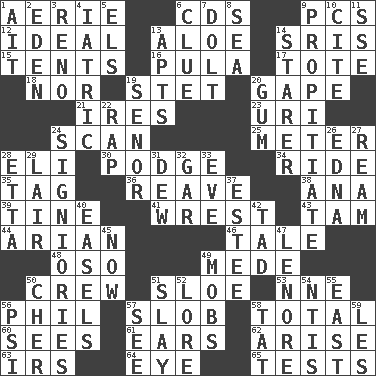 ACROSS 1. Nest on high 6. Music discs 9. Personal Computers (abbr.) 12. Perfect 13. _ vera 14. Indian titles of respect 15. Portable shelters 16. Monetary unit of Botswana 17. Lug 18. And not 19. Proofreading order 20. Yawn 21. Angers 23. RI univ. 24. Examine minutely or intensely 25. Distance measurement 28. Biblical high priest 30. Porridge 34. Travel on an animal 35. Label 36. Break or tear apart 38. Santa ___, CA 39. Prong on a fork 41. Take or capture by force 43. Scottish cap 44. Believer in; advocate of (suffix) 46. Falsehood 48. Bear (Spanish) 49. Ancient Persian 50. Ship's personnel 51. A type of plum 53. Compass dir. 56. Silvers or Donahue 57. Oscar Madison type 58. Add up to 60. Observes 61. Hearing organs 62. Originate 63. Big collection agency 64. Sight organ 65. Trials DOWN 1. Small island 2. Paradise 3. Former U.S. Attorney General Janet 4. Of or pertaining to medicine 5. Raised railways 6. A slight indication 7. Stupid person 8. Ocean 9. Appease 10. Quote 11. Compass dir. 13. Tenement units (abbr.) 14. A viewer who gazes fixedly 19. Sir (Sp.) 20. Chewing product 22. Strike 24. Seigniories (variant) 26. Pulitzer Prize-winning author Ferber 27. 480, 500 or 516 sheets of paper 28. Singer James 29. Den 31. Morning condensation 32. Slender fish 33. First lady 37. First name in cosmetics 40. Artist's stands 42. Small boy 45. Immediately 47. Poe poem 49. Crowds into 50. "Mermaids" star 51. Kill 52. Old wives' tales, e.g. 54. Nuclear Threat Initiatives 55. Compass direction 56. 23rd letter of the Greek alphabet 57. Perceive with the eye 58. Make lace 59. French article