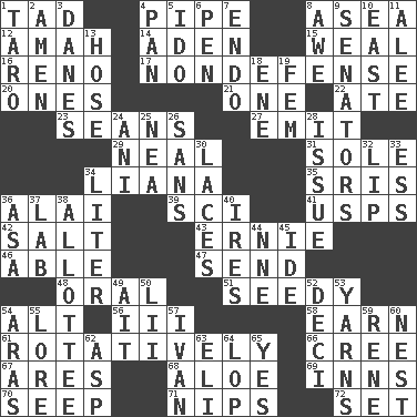 ACROSS 1. Small amount or degree 4. Corncob 8. Toward the sea 12. Housemaid 14. An important port of Yemen 15. Welt 16. Former U.S. Attorney General Janet 17. Unrelated to defense, as in spending 20. Singles 21. Single 22. Had dinner 23. Seines 27. Send forth 29. Actress Patricia 31. Not divided or shared with others 34. Climbing, woody, usually tropical vines 35. Indian titles of respect 36. Jai ____ 39. _-fi 41. United States Postal Service (abbr.) 42. Table seasoning 43. Bert's buddy 46. Competent 47. Post 48. Taken by mouth 51. Shabby and untidy 54. Keyboard modifier key 56. One more than two 58. Merit 61. Rotating or pertaining to rotation 66. Algonquian 67. Ancient Greek god of war 68. _ vera 69. Taverns 70. Ooze 71. Pinches, bites 72. Put into a specified state DOWN 1. Pacific island yam 2. So be it 3. Natives or inhabitants of Denmark 4. Baking dish 5. Wedding promise 6. Animal enclosure 7. Inside; within (prefix) 8. Deep reverence 9. Elected representatives 10. 90 degrees 11. Toward shelter 13. Stockings 18. Compass dir. 19. Opposite of masc. 24. Cuckoo 25. Teachers' org. 26. Without 28. Come out of 30. Shoestrings 32. Mouth edge 33. Double-curved letter 34. 61 cubic inches 36. White ___ sheet 37. Experiment locale 38. One to whom something is allotted 40. Angers 44. Compass dir. 45. Binary compound 49. Small island 50. Cards in a Roman deck? 52. Tenth: prefix 53. Entertaining tales 54. Caspian sea tributary 55. Old wives' tales, e.g. 57. "Terrible" tsar 59. French philosopher Descartes 60. Egg locale 62. Viper 63. Connecticut Ivy Leaguer 64. Trim (branches) 65. Consenting reply