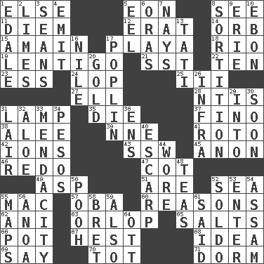 ACROSS 1. Otherwise 5. Age 8. Perceive with the eye 11. South Vietnam president (1954) 12. Part of Q.E.F. 14. Globe 15. At full speed 17. Beach, in Buenos Aires 18. River (Sp.) 19. Small, flat, pigmented spot on the skin 21. Fast jet (abbr.) 22. "___ Little Indians" 23. Curvy letter 24. Trim (branches) 25. One more than two 27. Pipe bend 28. Nuclear Threat Initiatives 31. Desk light 35. Pass on 37. Fine (Spanish) 38. Toward shelter 39. Compass dir. 41. Printing process, for short 42. Charged atoms 43. Compass dir. 45. At once, immediately (arch.) 46. Do over again 47. Small bed 49. Cleo's killer 51. "We ___ not amused" (Victoria) 52. Ocean 55. Apple computer (short form) 57. Chief or king in Benin or Nigeria 60. Thinks logically 62. Cuckoo 63. Lowest deck of a ship 65. Table seasonings 66. Plant holder 67. Behest 68. The main thing one is thinking about 69. Declare 70. Small child 71. Dormintory (informal) DOWN 1. Peak District village in England 2. Citrus fruits 3. Actors Connery and Penn 4. Give off 5. Snakelike fish 6. Mouths or openings 7. Negative votes 8. Making a chance decision by using lots 9. One of the Great Lakes 10. Inky black, to poets 13. Jacques of French films 16. Mediterranean tributary 17. Cotton for raincoats, e.g. 20. Precious metal 26. Kind of red light 29. To the inside or interior of 30. Within a short period 31. Den 32. Medicinal plant 33. Ananias' fault 34. Mexican monetary units 36. Followers of ems 40. Fortification 44. Had on 48. Afternoon social gatherings 50. "Silly old bear" 52. Twentieth part of a lira 53. Keyboard key 54. Indian state 55. Atlas contents 56. Small Philippine buffalo 58. Cy Young winner Saberhagen 59. In addition 61. Expressed in words 64. Baseball player Mel