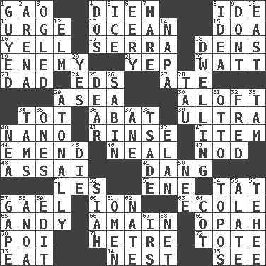 ACROSS 1. E Mali city 4. South Vietnam president (1954) 8. Binary compound 11. Goad 13. Sea 15. ___ good deed 16. Shout 17. Father Junipero _ 18. Cub Scout units 19. Foe 21. Slangy assent 22. Electrical Unit 23. Male parent 24. Begley and Asner 27. Had dinner 29. Toward the sea 30. Upward 34. Small child 36. Blind as ____ 39. Extreme 40. Billionth: prefix 41. Remove soap 43. A whole individual unit 44. Make improvements or corrections to 46. Be tempered by heat 47. Allow head to fall sleepily 48. Slender Brazilian palm 49. Mild oath, euphamism for damn 51. French article 53. Compass dir. 54. Make lace 57. Highlander 60. Electrically charged atom 63. Learning spot: Fr. 65. Actor Griffith 66. With great haste 69. Brightly colored fish 70. Luau course 71. Distance measurement (Brit.) 72. Lug 73. Erode 74. A home for chicks 75. Perceive with the eye DOWN 1. Steadied 2. Sports stadium 3. Stared 4. Two (Sp.) 5. Frozen water 6. Suggestive of the supernatural 7. Female horse 8. It may be bright or harebrained 9. Do not 10. 90 degrees 12. Shade tree 14. California wine valley 18. Home 20. It is so 25. Letter starter 26. Unit of acoustic absorption 28. The 19th letter of the Greek alphabet 29. Without tonality 31. "Beetle Bailey" pooch 32. Flintstone 33. Scottish cap 34. Scottish caps 35. Singles 37. One (Scot) 38. Sadhe (variant) 40. Teachers' org. 42. Enthusiasm 45. Expire 50. Born 52. Thailand, formerly 54. Literary convention 55. Having winglike extensions 56. Giggle 57. Stare wonderingly 58. Small Philippine buffalo 59. Prepare for publication 61. Presage 62. Nathan's nickname 64. Small bed 67. Big collection agency 68. Fish or hair follower