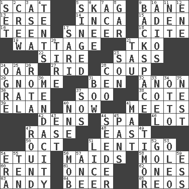 ACROSS 1. Go away! 5. Heroin 9. Object of repulsion 13. Celtic language 14. South American Indian 15. Arabian gulf 16. Adolescent 17. Scornful expression 18. Quote 19. Electrical Measurement 21. Ring climax 22. Father 23. Backtalk 24. Boat paddle 27. To free from 28. Clever action or accomplishment 29. Dwarf 31. Benjamin's nick name 32. At once, immediately (arch.) 36. Assign a rank or rating to 37. "Barney Miller" actor Jack 38. ____ d'Azur (French Riviera) 39. Liveliness 40. Immediately 41. Confronts 42. Cub Scout units 44. Health resort 46. Car dealer's back yard 47. To erase 48. Compass direction 50. Sep. follower 51. Small, flat, pigmented spot on the skin 54. Needle holder 56. Women servants 58. Undercover agent 60. Monthly bill 61. At one time in the past 62. Washington bills 63. "60 Minutes" Commentator Rooney 64. Fermented drink made from hops 65. Vintage cars DOWN 1. Arrange properly for use 2. Ship's personnel 3. At sea 4. Portable shelters 5. Scorched 6. Leg joint 7. Adept person 8. Slender fish 9. Keyboard key 10. Goodbye (Sp.) 11. Fish or hair follower 12. Compass dir. 17. Indian skirt 20. Hoop that covers a wheel 21. The 19th letter of the Greek alphabet 23. Manchild 24. Legendary monster 25. Of or related to the anus 26. Round or rotation of duties 28. Corporate head (abbr.) 30. Ananias' fault 31. Ribbon knot 33. Christmas carol 34. "Beetle Bailey" pooch 35. Egg locale 37. Distress signal 40. Compass dir. 41. Vertical spar for supporting sails 43. Eastern Standard Time (abbr.) 44. Sowing specialist 45. Baking dishes 47. One shot 49. The easternmost of the Lesser Sundas 51. Louse (plural) 52. Went 53. Margarine 54. Epoch 55. Nine, plus one 56. Disorderly crowd 57. One (Scot) 59. Curvy letter