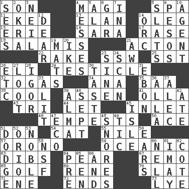 ACROSS 1. Male child 4. Wise men 8. Health resort 11. Made supply last 13. Style 14. Cassini of fashion 15. One of the Great Lakes 16. "Two Mules for Sister ____" 17. To erase 18. Deli grouping 21. NE Massachussets city 22. Libertine 23. Compass dir. 25. Fast jet (abbr.) 26. Connecticut Ivy Leaguer 29. One of the two male reproductive glands 32. Ancient Roman robes 34. Santa ___, CA 35. Sound made by sheep 38. Calm and collected 39. NE Netherlands city 41. Rounded earthenware pot or jar 43. Three (prefix) 44. Allow 45. An arm off of a larger body of water 46. Storms 50. Adept person 51. Spanish title 54. Domesticated feline 55. "Death on the ____" 57. U. of Maine site 59. Pertaining to the sea 63. Rights 64. Lightbulb-shaped fruit 67. San ____ (Riviera town) 68. Eighteen holes 69. French philosopher Descartes 70. Narrow board 71. Compass dir. 72. Extremities 73. Sodium hydroxide DOWN 1. Perceives with the eye 2. Gumbo ingredient 3. Famous astronaut Armstrong 4. Makes clutter 5. In the manner of 6. Slender fish 7. _ tizzy (2 wds.) 8. Narrow boards 9. Mexican monetary units 10. Rep 12. Letter starter 14. The grampus (Milton) 19. Floor coverings 20. Mamie's husband 21. Leather borer 23. Trig term 24. Glance over 26. And so on (abbr.) 27. Plunder 28. Composer Stravinsky 30. Clothes sense 31. Inky black, to poets 33. Came down and settled, as after flight 36. Silent film actress Nazimova 37. Actor Baldwin 39. _ mater 40. Back-to-school mo. 42. Had dinner 45. Small island 47. Environmental prefix 48. Sounds asleep 49. Nervous spasm 51. Evade 52. Constellation of myth 53. Impressive in appearance 56. Hearing organs 58. Overdraft (abbr.) 60. 1994 drama film starring Jodie Foster 61. "If ____ say so..." 62. ____ d'Azur (French Riviera) 64. Before (prefix) 65. Car or cant ending 66. Also