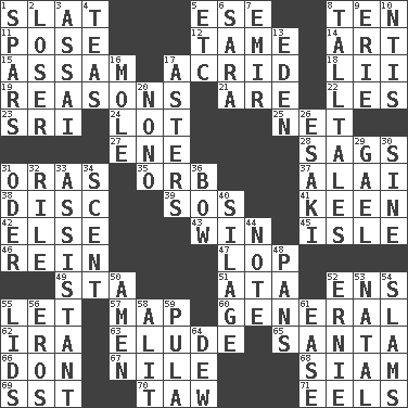 ACROSS 1. Narrow board 5. Compass dir. 8. Nine, plus one 11. Airs 12. Not wild 14. Tate display 15. Indian state 17. Sour-tasting 18. Cards in a Roman deck? 19. Thinks logically 21. "We ___ not amused" (Victoria) 22. French article 23. _ Lanka 24. Car dealer's back yard 25. Fish or hair follower 27. Compass dir. 28. Settles 31. Mouths or openings 35. Globe 37. Jai _ 38. Plate 39. Mayday 41. Peachy ____! 42. Otherwise 43. Acquire through effort 45. Capri or Wright 46. It's straight from the horse's mouth 47. Chop off 49. R.R. building 51. _ moment's notice (2 wds.) 52. Followers of ems 55. Allow 57. Atlas unit 60. Commissioned military rank 62. Retirement account (abbr.) 63. Evade 65. Before Barbara or Clara 66. Spanish title 67. "Death on the ____" 68. Thailand, formerly 69. Fast jet (abbr.) 70. The 23rd letter of the Hebrew alphabet 71. Snakelike fish DOWN 1. Practice fights 2. Failure 3. Slender Brazilian palm 4. Afternoon social gatherings 5. And so on (abbr.) 6. "Two Mules for Sister ____" 7. Arab leader 8. Baron Munchausen's specialties 9. 4th largest of the Great Lakes 10. Nuclear Threat Initiatives 13. Genesis locale 16. Undercover agent 17. Michaelmas daisies 20. Words to Nanette 26. 1973 Nobel Price Winner (Physics) Leo 29. Highlander 30. Trig term 31. River in Europe 32. Cause heat under the collar 33. Helper 34. Odor 36. Arrow shooter 40. Fodder prepared in a silo 44. Short letter 48. Baking dishes 50. So be it 52. Bert's buddy 53. Relating to or accompanying birth 54. Hits or strikes with great force 55. Hats (slang) 56. Greek god of love 58. Set down 59. Monetary unit of Botswana 61. Relaxation 64. Morning condensation