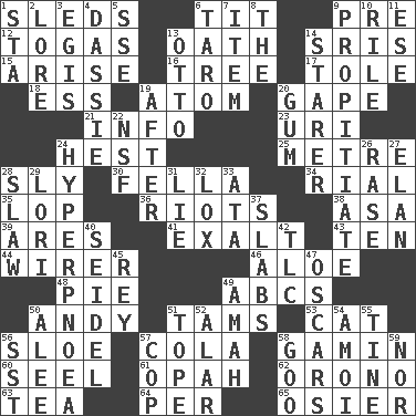 ACROSS 1. Bobsleighs 6. Teat (slang) 9. Before (prefix) 12. Ancient Roman robes 13. Pledge 14. Indian titles of respect 15. Originate 16. Family _ (genealogy) 17. Lacquered or enameled metalware 18. Double-curved letter 19. Tiny particle 20. Stare wonderingly 21. Information 23. RI univ. 24. Behest 25. Distance measurement (Brit.) 28. Playfully artful 30. Chap (slang) 34. Monetary unit of Yemen 35. Chop off 36. Debaucheries 38. White ___ sheet 39. Ancient Greek god of war 41. Honor 43. Nine, plus one 44. One who wires 46. Medicinal plant 48. Sliced dessert 49. Lettered men learn these first 50. Actor Griffith 51. Scottish caps 53. Feline 56. A type of plum 57. Root beer relative 58. Street urchin 60. Stitch closed the eyes of (a falcon) 61. Brightly colored fish 62. U. of Maine site 63. Beverage made from leaves 64. For each 65. Flexible twig of a willow tree DOWN 1. R.R. building 2. Old wives' tales, e.g. 3. Armor plate that protects the chest 4. Small ungulate mammals of Africa 5. Compass dir. 6. Edible starchy tuberous root 7. A distinct part 8. Definite Article 9. Conciliate 10. Cause heat under the collar 11. Compass dir. 13. "Beetle Bailey" pooch 14. A viewer who gazes fixedly 19. Following 20. Chewing product 22. Overdraft (abbr.) 24. Abnormally rapid or deep breathing 26. To erase 27. Style 28. Cole _ (cabbage dish) 29. Australian parrot (variant) 31. Falsehood 32. Brine-cured salmon 33. "One Day ___ Time" 37. Broad, flat, thick pieces 40. Beer mug 42. Affectionate concern, for short 45. Marina Del _, California 47. Motion picture awards 49. Nanny 50. Toward shelter 51. Drink excessively 52. Having or resembling wings 54. Mine, in Marseilles 55. Prong on a fork 56. Fast jet (abbr.) 57. Police officer (slang) 58. Thick or sticky substance 59. Or not