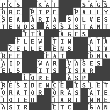ACROSS 1. Personal Computers (abbr.) 4. Krazy ___ of comics 7. Sinks 11. The grampus (Milton) 12. Corncob 13. Friendly 14. Ocean 15. Roberta Peters solo 16. Finds the solution 17. Looks after 19. Aide 21. Call ___ day 23. Eons 24. Soared 25. Metal container 26. _ moment's notice (2 wds.) 29. Cell (Danish) 30. Followers of ems 31. 54 in ancient Rome 32. To riddle 33. Consume 34. Heredity factor (abbr.) 35. Assist 36. Armed conflict 37. Flower holders 40. Raised railways 41. ___ a Wonderful Life 42. Austrian river, tributary to the Danube 43. Old wives' tales, e.g. 45. Cleo's killer 46. Home 51. Small island 55. Speaker 56. Mouths or openings 58. Had dinner 59. Carrier 60. Small pie 61. Compass dir. 62. SW Saudi Arabia district 63. And so on (abbr.) 64. Separate the seeds from cotton DOWN 1. Mail 2. Algonquian 3. Examine minutely or intensely 4. Apertif with cassis 5. Capital of Western Samoa 6. Beverages made from leaves 7. Table seasonings 8. Inventor's middle name 9. Small, secluded valley 10. System (abbr.) 12. Soft color 13. Introduce or present, as a question 16. Attaches a signature 18. Deli pickle 20. Inhabitant of Heaven 22. Deep reverence 24. Eats 25. Lacerates 26. Tree or shrub in the Birch family 27. Metal containers 28. Actress Gardner 29. To provide with a ceiling 32. Actress Charlotte 33. Ingested 36. One who wires 37. By way of 38. Aid 39. Plant excrements 43. 61 cubic inches 44. Scent 46. Roll call or roster of names 47. Greek god of love 48. Suttee (variant) 49. ____ d'Azur (French Riviera) 50. Part of Q.E.F. 52. Long (Scottish) 53. Inactive volcano in Sicily 54. Adolescent 57. Curve