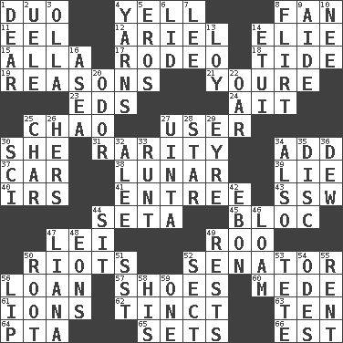 ACROSS 1. Superhero pair 4. Shout 8. Air blower 11. Snakelike fish 12. Satellite of Uranus 14. Writer Wiesel 15. Silent film actress Nazimova 17. Cowboy competition 18. Periodic rise and fall of the sea level 19. Thinks logically 21. You are 23. Begley and Asner 24. Small island 25. US Secretary of Labor Elaine L. _ 27. One who makes use of a thing 30. A female animal or person 31. Noteworthy scarcity 34. Increase 37. 4-wheeled motor vehicle 38. Type of eclipse 39. Untruth 40. Big collection agency 41. Main course 43. Compass dir. 44. Stalk of a moss capsule 45. Coalition 47. Luau accessory 49. Friend of Pooh 50. Debaucheries 52. Elected representative 56. Grant temporary use of 57. Imelda's hoard 60. Ancient Persian 61. Charged atoms 62. Tinged 63. Nine, plus one 64. Parent Teacher Association (abbr.) 65. Puts into a specified state 66. Eastern Standard Time (abbr.) DOWN 1. Letter starter 2. Ubangi River tributary 3. Rounded earthenware pot or jar 4. Entertaining tales 5. Greek god of love 6. Flaplike covering 7. Area sheltered from the wind 8. Talk or behave amorously 9. Helper 10. Born 13. Myrna of the movies 14. Needle case 16. Toward the sea 20. Scent 22. Boat paddle 25. Burn to charcoal 26. Possessive pronoun 27. National forest in Provo, Utah 28. Play the lead 29. Jane of fiction 30. _-fi 32. Toward shelter 33. Undersized animal 34. In addition 35. Plate 36. Morning condensation 42. Inky black, to poets 44. Be seated 46. Rich soil 47. Climbing, woody, usually tropical vines 48. Immeasurably long periods of time 49. Musical pauses 50. Carrot, for example 51. Fast jet (abbr.) 52. Religious group 53. Wig 54. Lyric poems 55. Monthly bill 56. Mouth edge 58. Part of HMS, perhaps 59. Single