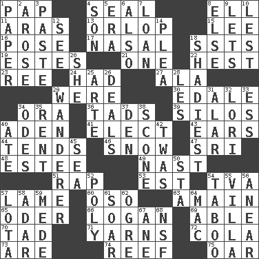 ACROSS 1. Infant food 4. Lick closed 8. Pipe bend 11. Ancient river in northeast Turkey 13. Lowest deck of a ship 15. Area sheltered from the wind 16. Airs 17. Relating to the nose 18. Fast planes 19. _____ Park, CO 21. Single 22. Behest 23. Portuguese money of account (variant) 24. Possessed 27. Chicken ___ king 29. Past tense of be (plural) 30. Peak District village in England 34. Mouth or opening 36. Bits 39. Grain storage towers 40. Arabian gulf 41. Opt 43. Hearing organs 44. Looks after 46. Overwhelm 47. _ Lanka 48. First name in cosmetics 49. Political cartoonist Thomas 51. Reproach for some lapse or misdeed 53. Eastern Standard Time (abbr.) 54. Federal power corp. 57. Unable to walk 60. Bear (Spanish) 63. With great haste 65. River in Europe 66. Utah city north of Ogden 69. Competent 70. Bit 71. Tall tales 72. Root beer relative 73. "We ___ not amused" (Victoria) 74. Coral ridge 75. Rowing implement DOWN 1. Some stationery 2. Came up 3. Thick mixture 4. Boy, to dad 5. Epoch 6. In addition 7. Grant temporary use of 8. Otherwise 9. Allows 10. For fear that 12. Observe 14. Entreaty 18. Most questionable 20. A female animal or person 25. Johnson of "Laugh-In" 26. Allots cards 28. French article 29. Roamer 31. Having or resembling wings 32. Australian parrot (variant) 33. Double-curved letter 34. Lyric poems 35. Monthly bill 37. Lair 38. Biscuitlike quick bread 40. Had dinner 42. It was, poetically 45. Ocean 50. R.R. building 52. Many (prefix) 54. Off limits 55. Country estate 56. Approach 57. Globular water bottle used in Asia 58. The sixth month of the Jewish calendar 59. Ancient Persian 61. Fly high 62. Legendary monster 64. Big _ 67. One (Scot) 68. Overdraft (abbr.)