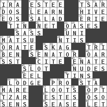 ACROSS 1. Retirement account (abbr.) 4. First name in cosmetics 9. Russian ruler of old 13. Two (Sp.) 14. Memorize 15. Hub of activity 16. Greek goddess of the dawn 17. First course 18. One of the Great Lakes 19. Metal container 21. Fish or hair follower 22. Fertile tracts in a desert 24. Backtalk 26. Corn or form start 27. Taiwanese island in East China Sea 29. Nuclear Threat Initiatives 30. Speak pompously 31. Heroin 33. Three (prefix) 36. Benjamin's nick name 37. Legislator 40. Boat paddle 41. Fast jet (abbr.) 42. Quote 43. Maternal 45. Position in a hierarchy or organization 47. Unclothed pictures 48. Snakelike fish 49. Metal containers 50. Inn 52. Adept person 54. R.R. building 56. Female horse 57. Plunders 59. Elect 61. Czar 62. _____ Park, CO 63. Bear (Spanish) 64. Elected reps. 65. Gospel singer Marvin 66. Allow DOWN 1. Binary compound 2. Carrot, for example 3. Aide 4. Raised railways 5. Actors Connery and Penn 6. Falsehood 7. Part of Q.E.F. 8. Conclusion 9. College paper 10. Beget 11. Opinion 12. To riddle 20. Political cartoonist Thomas 22. Money paid out 23. Cuckoo 25. Institutes legal proceedings 27. Disorderly crowds 28. Ancient Greek god of war 29. Nathan's nickname 31. In a ____ (agitated or irritated) 32. Krazy ___ of comics 33. Inedible or poisonous agaric 34. Assign a rank or rating to 35. Angers 38. Learning spot: Fr. 39. Painter Guido (1575-1642) 44. Religious women 45. Spring feasts 46. Part of a journey 49. Lugs 50. Goldbrick 51. Northwest Algerian city 52. Introduce or present, as a question 53. Round or rotation of duties 55. Domed church section 56. Mountains (abbr.) 57. French article 58. Compass dir. 60. Small child