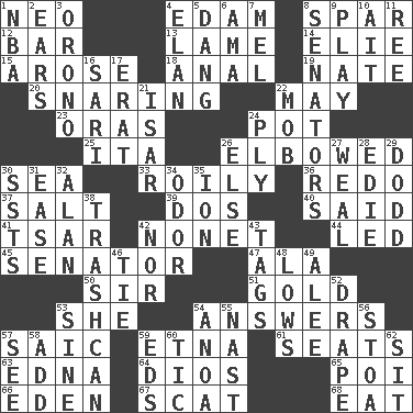 ACROSS 1. Modern: prefix 4. Dutch treat 8. Coast Guard woman 12. Tavern 13. Unable to walk 14. Writer Wiesel 15. Came up 18. Of or related to the anus 19. Nathan's nickname 20. Catching in a trap 22. Can I? 23. Mouths or openings 24. Plant holder 25. Call ___ day 26. Turned at an angle; bent 30. Ocean 33. Agitated, as a liquid 36. Redecorate 37. Table seasoning 39. Two (Sp.) 40. Expressed in words 41. Russian ruler of old 42. Music written for nine 44. Directed 45. Elected representative 47. In the manner of 50. Title for a knight 51. Gilt 53. A female animal or person 54. Statements in reply to questions 57. Ketch in the Levant 59. Inactive volcano in Sicily 61. Theater features 63. Pulitzer Prize-winning author Ferber 64. "Vaya con ____" 65. Luau course 66. Locale of original sin 67. Go away! 68. Ingest DOWN 1. Basketball assoc. 2. Hearing organs 3. U. of Maine site 4. Enthusiasm 5. Mild oath, euphamism for damn 6. Wet nurse (var.) 7. Cartoonist voice _ Blanc 8. Legislators 9. Romp 10. Small island 11. Portuguese money of account (variant) 16. Indian skirt 17. Part of Q.E.F. 21. Austrian river, tributary to the Danube 22. Disorderly crowd 24. Strand of rope, yarn or thread 26. Otherwise 27. Welt 28. Singer Brickell 29. Texas town _ City 30. Fast planes 31. Comfort 32. ____ Jay Lerner 34. Aroma 35. Electrically charged atom 38. File 13 42. Not either 43. Labels 46. Standoff 48. Coldest temperatures 49. Toward shelter 52. Window treatment 53. Trig term 54. Small Philippine buffalo 55. Political cartoonist Thomas 56. Portico 57. Perceive with the eye 58. Find the sum of 59. Begley and Asner 60. Nervous spasm 62. Be seated