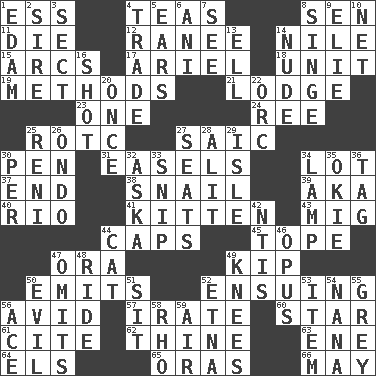 ACROSS 1. Double-curved letter 4. Beverages made from leaves 8. Elected rep. 11. Pass on 12. The wife of a rajah (variant) 14. "Death on the ____" 15. Curves 17. Satellite of Uranus 18. A single undivided whole 19. Modes 21. Cabin 23. Single 24. To separate or throw off 25. College mil. group 27. Ketch in the Levant 30. Writing instrument 31. Artist's stands 34. Car dealer's back yard 37. Conclude 38. Slow-paced one 39. Alias (abbr.) 40. River (Sp.) 41. Baby cat 43. Russian fighter aircraft 44. Smile enhancers 45. Drink excessively 47. Mouth or opening 49. Monetary unit of Laos 50. Sends forth 52. Taking place subsequently 56. Enthusiastic 57. Feeling or showing extreme anger 60. Play the lead 61. Quote 62. One or ones belonging to thee 63. Compass dir. 64. Raised railways 65. Mouths or openings 66. Fifth month DOWN 1. Dutch treat 2. Male parent of an animal 3. Religious group 4. Exchange 5. Hearing organs 6. Cuckoo 7. Perceive with the eye 8. Scorch 9. Writer Wiesel 10. Fish or hair follower 13. Pipe bend 14. Naked 16. Guess 20. At one time in the past 22. The grampus (Milton) 25. Painter Guido (1575-1642) 26. Southwest Nigerian state 27. Theater features 28. Set down 29. Small island 30. For each 32. "____ silly question..." 33. Sever or remove by pinching or nipping 34. Desk light 35. Migrant worker of the '30s 36. Label 42. Nuclear Threat Initiatives 44. Domesticated feline 46. Musical composition 47. Leaves out 48. Travel on an animal 49. Leg joints 50. Morally bad or wrong 51. Be seated 52. Inactive volcano in Sicily 53. A whole individual unit 54. Grandmother 55. Jennifer or Joel 56. Adept person 58. 17th letter of the Greek alphabet 59. Atmosphere