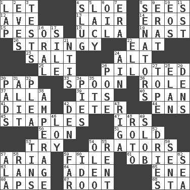 ACROSS 1. Allow 4. A type of plum 8. Perceives with the eye 12. "___ Maria" 13. Den 14. Greek god of love 15. Mexican monetary units 18. Southern CA. univ. 19. Political cartoonist Thomas 20. Slender, wiry 22. Erode 23. Table seasoning 24. Keyboard modifier key 25. Luau accessory 26. Manned the helm 30. Infant food 33. Soup utensil 36. Hero or heavy, e.g. 37. Silent film actress Nazimova 39. ___ a Wonderful Life 40. Connect, as a bridge 41. South Vietnam president (1954) 42. Prevent from occurring 44. Followers of ems 45. Paper fasteners 47. Big collection agency 50. A really long time 51. Aureate 53. Attempt to accomplish something 54. Speakers 57. Operatic vocal solo 59. Do some clerical work 61. Off-Broadway awards 63. Austrian-born American filmmaker Fritz 64. Arabian gulf 65. Compass dir. 66. Domed church section 67. Carrot, for example 68. R.R. building DOWN 1. Infant locale 2. Nights before holidays 3. Trials 4. A hard, heavy blow 5. Made of lace 6. Petroleum 7. Epoch 8. Elected representatives 9. Part of Q.E.F. 10. Greek goddess of the dawn 11. Fast jet (abbr.) 16. Of the mouth 17. Filth; sediment 21. Nuclear Threat Initiatives 22. Pipe bend 24. The 18th letter of the Arabic alphabet 26. Airs 27. Drink excessively 28. Liveliness 29. Hiding places for outlaws 30. Writing tablets 31. Set down 32. Entreaty 34. Sliced desserts 35. Baseball player Mel 38. Electrical Measurement 42. Lair 43. Port city in Latvia 46. Myrna of the movies 48. Printing process, for short 49. Messy guy 52. Frees from moisture 53. Airtight sealed metal containers 54. Butter sub 55. Monthly bill 56. Emitted 57. Chicken ___ king 58. Reproach for some lapse or misdeed 59. Distant 60. Wedding promise 62. Ocean