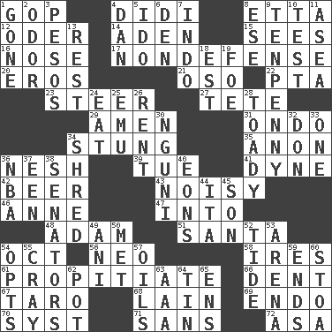 ACROSS 1. Grand Old Party 4. "You Light Up My Life" star Conn 8. Singer James 12. Baltic tributary 14. An important port of Yemen 15. Perceives with the eye 16. Characteristic smell of wine 17. Unrelated to defense, as in spending 20. Greek god of love 21. Bear (Spanish) 22. Parent Teacher Association (abbr.) 23. Bull 27. Wig 29. So be it 31. Southwest Nigerian state 34. Feeling sharp psychological pain 35. Soon (poet.) 36. Delicate 39. Third day of the wk. 41. Unit of force 42. Fermented drink made from hops 43. Annoyingly loud 46. Singer Murray 47. To the inside or interior of 48. First of billions? 51. Before Barbara or Clara 54. Sep. follower 56. Modern: prefix 58. Angers 61. Conciliate 66. Incision 67. Edible starchy tuberous root 68. (Had) reclined 69. Inside; within (prefix) 70. System (abbr.) 71. Without 72. White ___ sheet DOWN 1. Went 2. Aroma 3. Mexican monetary units 4. One of the 12 tribes of Israel 5. Wedding promise 6. Lair 7. _ china 8. Compass dir. 9. 3-inch nail 10. Trial 11. Toward the sea 13. Repose 18. Eastern Standard Time (abbr.) 19. Enemy 24. Erode 25. Australian flightless bird 26. Monthly bill 28. Sycophant 30. Group of southern Bantu languages 32. Spanish title 33. Single 34. Fragment 36. Basketball assoc. 37. Car or cant ending 38. Legislators 40. Immeasurably long periods of time 44. Call ___ day 45. Manchild 49. Cuckoo 50. Was introduced to 52. Periodic rise and fall of the sea level 53. Sports stadium 54. Chooses 55. Supercomputer manufacturer 57. Lubricates 59. Conclusions 60. Portico 62. Plant holder 63. American Automobile Association (abbr.) 64. Shallow baking pan 65. Followers of ems