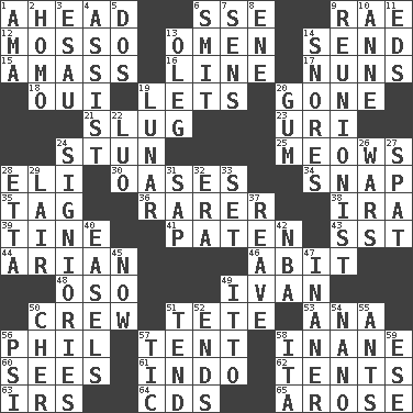 ACROSS 1. Having the leading position 6. Compass dir. 9. Actress Charlotte 12. With motion or animation 13. Sign of things to come 14. Post 15. Collect or gather 16. Actor's bit 17. Religious women 18. Fr. "Yes" 19. Allows 20. Went 21. A hard, heavy blow 23. RI univ. 24. Astound 25. Catcalls? 28. Biblical high priest 30. Fertile tracts in a desert 34. Fastener 35. Label 36. More uncommon 38. Retirement account (abbr.) 39. Prong on a fork 41. Eucharist need 43. Fast jet (abbr.) 44. Believer in; advocate of (suffix) 46. "This won't hurt ____!" 48. Bear (Spanish) 49. _ the terrible 50. Group working together 51. Wig 53. Santa ___, CA 56. Silvers or Donahue 57. Portable shelter 58. Empty; void 60. Perceives with the eye 61. _ china 62. Portable shelters 63. Big collection agency 64. Music discs 65. Came up DOWN 1. Nanny (var.) 2. Like (prefix) 3. He sold his birthright 4. Aid 5. Two (Sp.) 6. Stricken, poetically 7. Elected reps. 8. Compass dir. 9. One who advocates reunion 10. Queen of England 1702-14 11. Begley and Asner 13. Cassini of fashion 14. Sounds asleep 19. Type of eclipse 20. Chewing product 22. Nilotic language 24. Seigniories (variant) 26. Armed conflicts 27. Petty quarrel 28. Singer James 29. Den 31. Plant excrement 32. Epoch 33. Arrange properly for use 37. Break or tear apart 40. Artist's stands 42. Basketball assoc. 45. Immediately 47. Sillier 49. "Tell ____ the Marines!" 50. "Mermaids" star 51. Look after 52. Conclusions 54. Billionth: prefix 55. Pismires 56. 23rd letter of the Greek alphabet 57. Nervous spasm 58. Call ___ day 59. Compass dir.