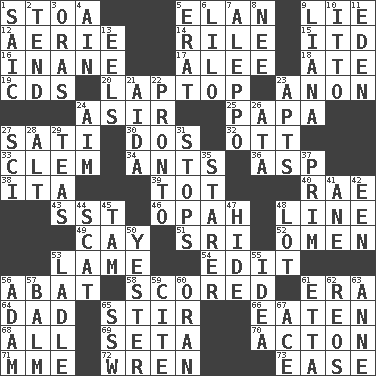 ACROSS 1. Portico 5. Enthusiasm 9. Falsehood 12. Nest on high 14. Cause heat under the collar 15. It would 16. Lacking in sense or substance 17. Toward shelter 18. Had dinner 19. Music discs 20. Portable computer 23. At once, immediately (arch.) 24. SW Saudi Arabia district 25. Dad 27. Suttee (variant) 30. Two (Sp.) 32. Baseball player Mel 33. Clement's nick name 34. Pismires 36. Cleo's killer 38. Call ___ day 39. Small child 40. Actress Charlotte 43. Fast jet (abbr.) 46. Brightly colored fish 48. Actor's bit 49. Island 51. Indian title of respect (Mr.) 52. Sign of things to come 53. Unable to walk 54. Prepare for publication 56. Blind as ____ 58. Tallied 61. Period 64. Male parent 65. Commotion 66. Consumed 68. Everything 69. Bristle 70. Gambison 71. Madame (abbr.) 72. Songbird 73. Comfort DOWN 1. Ketch in the Levant 2. Watch over 3. Mouths or openings 4. The 18th letter of the Arabic alphabet 5. Part of Q.E.F. 6. _ and Stitch 7. City in Syria 8. Born 9. Woody, climbing, usually tropical plant 10. "Tell ____ the Marines!" 11. Locale of original sin 13. Snakelike fish 21. Opera by Verdi 22. Right away 23. Tenement units (abbr.) 24. Direct toward a target or goal 26. "One Day ___ Time" 27. _-fi 28. The first octave above the treble staff 29. Beverages made from leaves 31. Halts 35. A viewer who gazes fixedly 37. Demure 41. A saturated hydrocarbon 42. Car or cant ending 44. Jazz singing style 45. Scottish cap 47. Flintstone garb 48. Car dealer's back yard 50. Of or pertaining to yesterday 53. Dipping utensil 55. The main thing one is thinking about 56. First of billions? 57. Lip ointment 59. Quote 60. NW Algerian seaport 61. Singer James 62. Vintage cars 63. Singer Murray 65. Compass dir. 67. Adept person